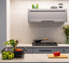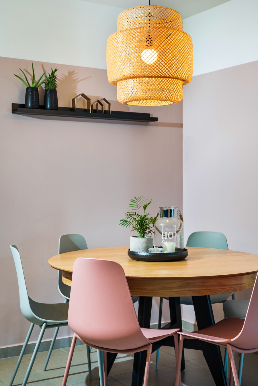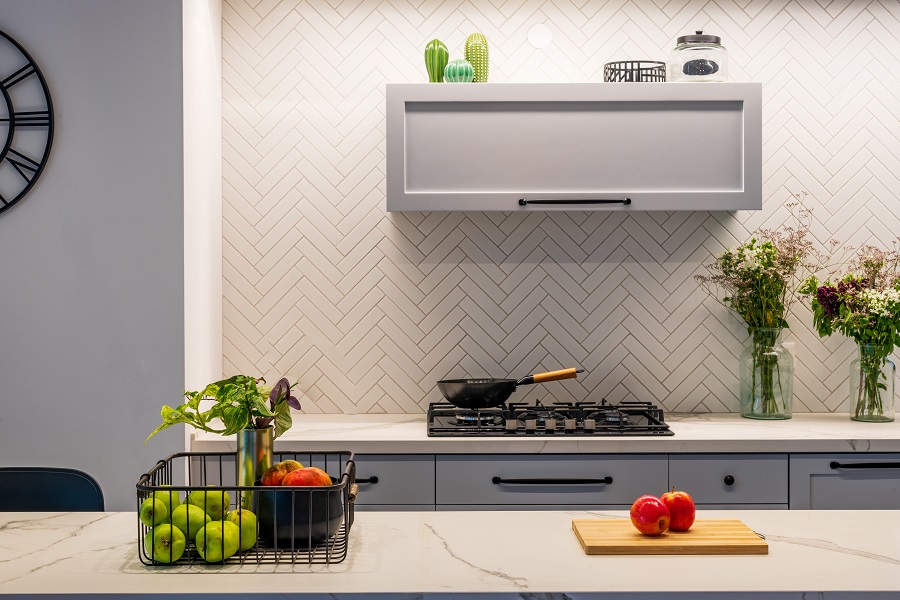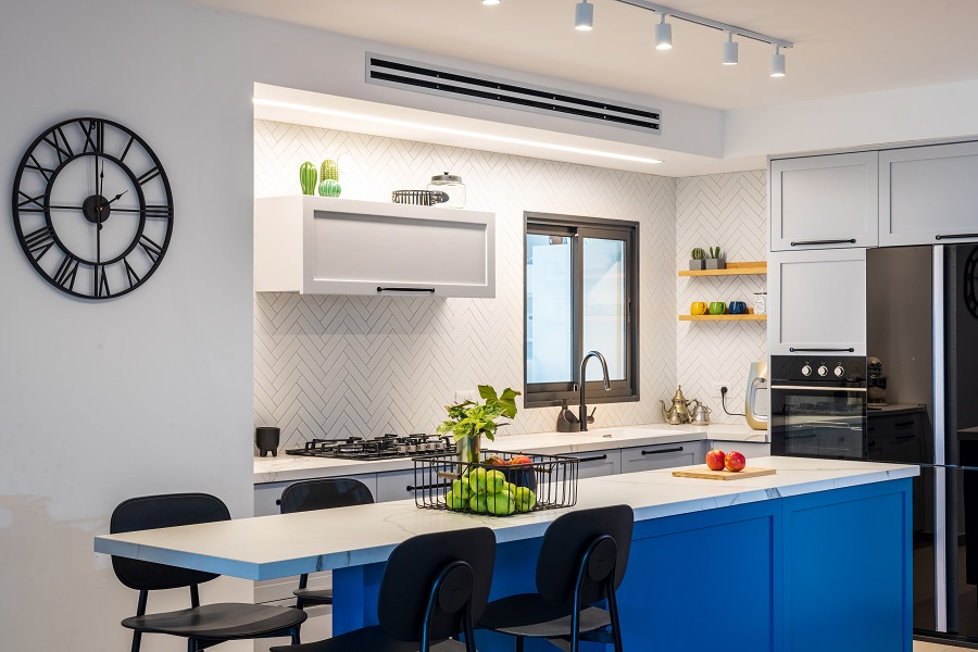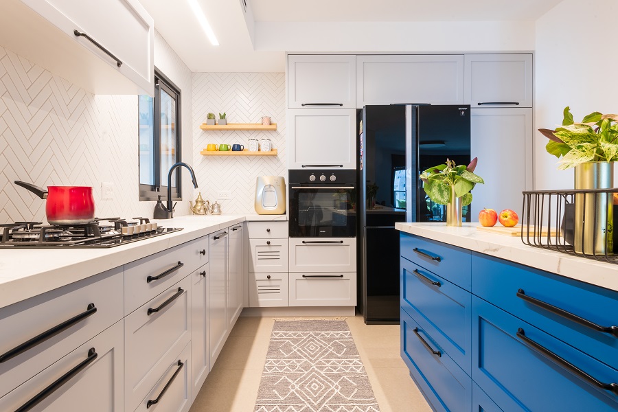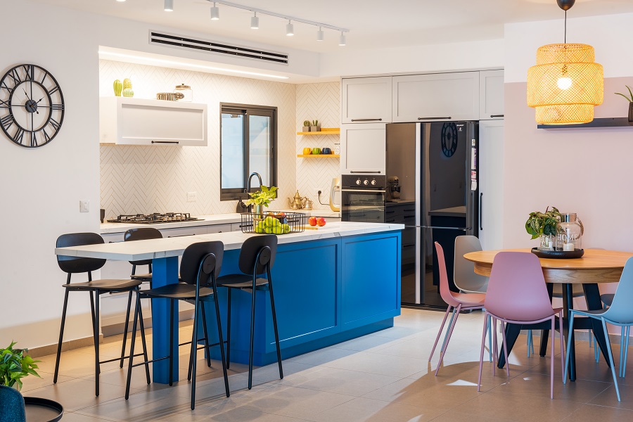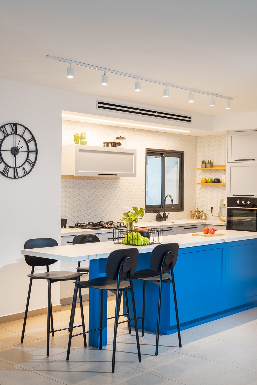 ע"י הקבלן הוחלט מראש לוותר, כדי לחסוך את עלויות הפירוק שלו. בעזרת תכנון מחדש ושינוי מיקומים עוצב מטבח רחב ידיים שישמש את הזוג שאוהב לבשל ולארח. האי הארוך מוקם מול דלת הכניסה ונעשתה בחירה בפלטת צבעים צבעונית ולא שגרתית, המקבלת את הנכנסים מהמבט הראשון.
