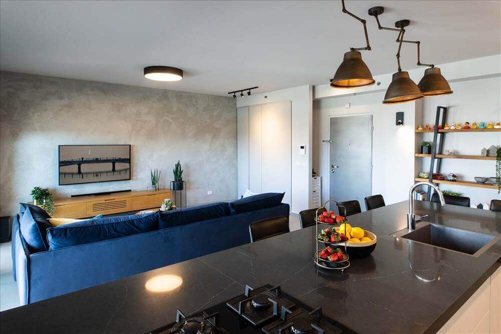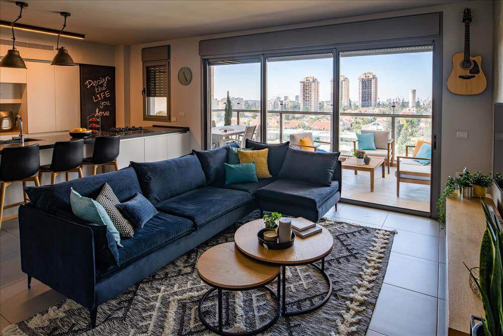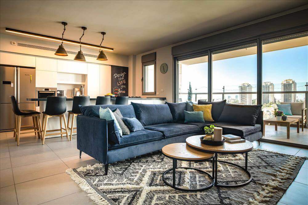 הציר השלישי- הספה הניצבת במקביל לאי קיבלה נוכחות נועזת בבחירת בד בגוון כחול ג'ינס.
