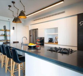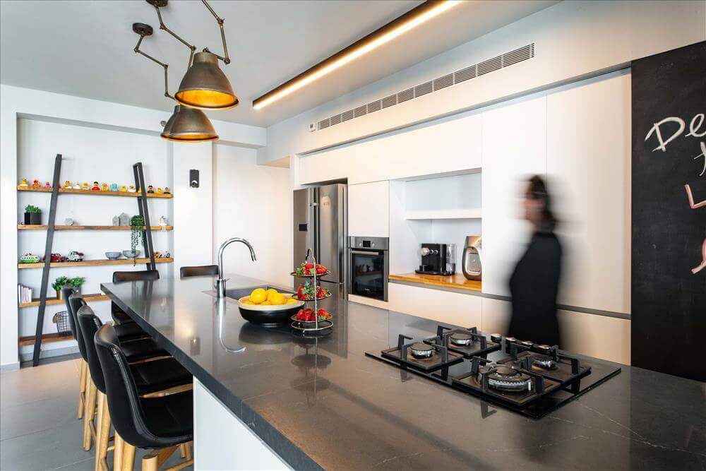הציר הראשון המטבח- כל הפונקציות הסגורות והאחסון, מסתור המיזוג ועמדת קפה.