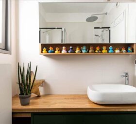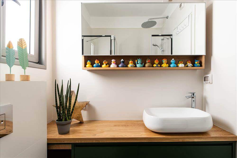 בעלי הבית אוהבים לאסוף ברווזים מגומי מכל מיני מקומות בעולם, לאחר התלבטויות רבות הוחלט לייעד להם מדף בחדר הרחצה כחלק מתכנון הארון.