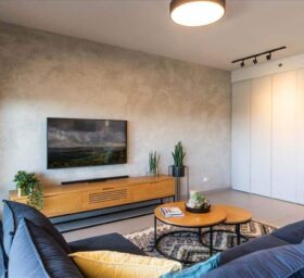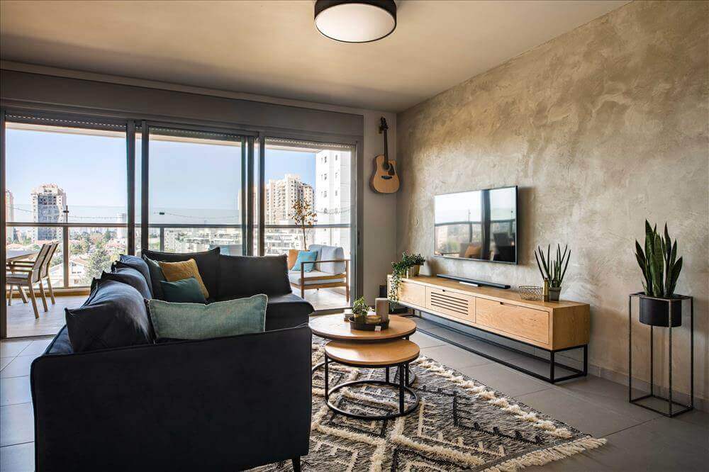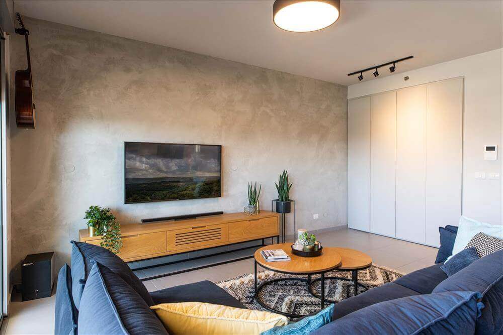 הציר הרביעי- קיר הטלוויזיה שנצבע בטיח מינרלי ערבה בגוון אפור אבן הנותן מראה בטוני ומעשיר את החלל.
