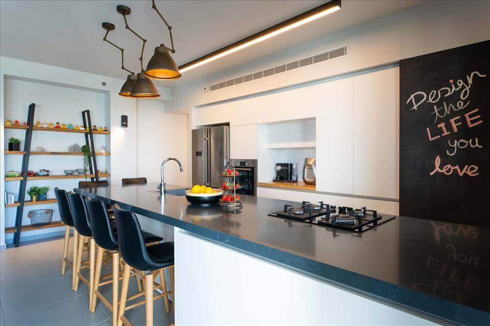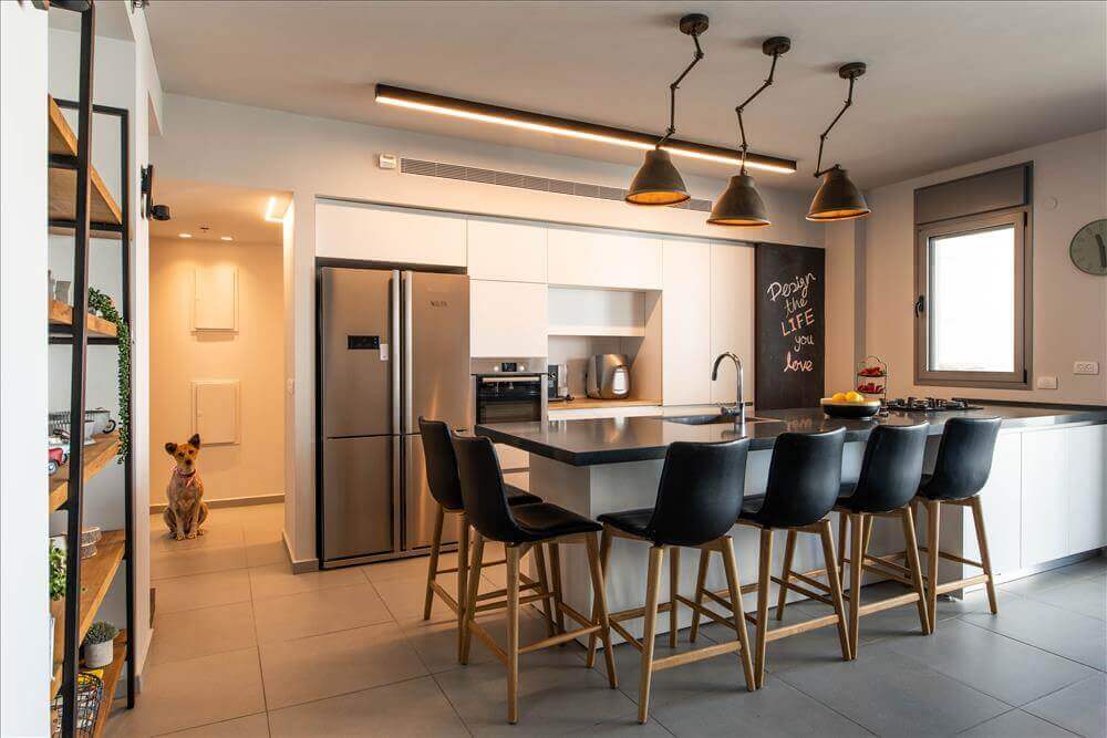 הציר השני- אי רחב שהוא גם מרכז המטבח וגם פינת ישיבה נוחה המחליפה את פינת האוכל המסורתית.