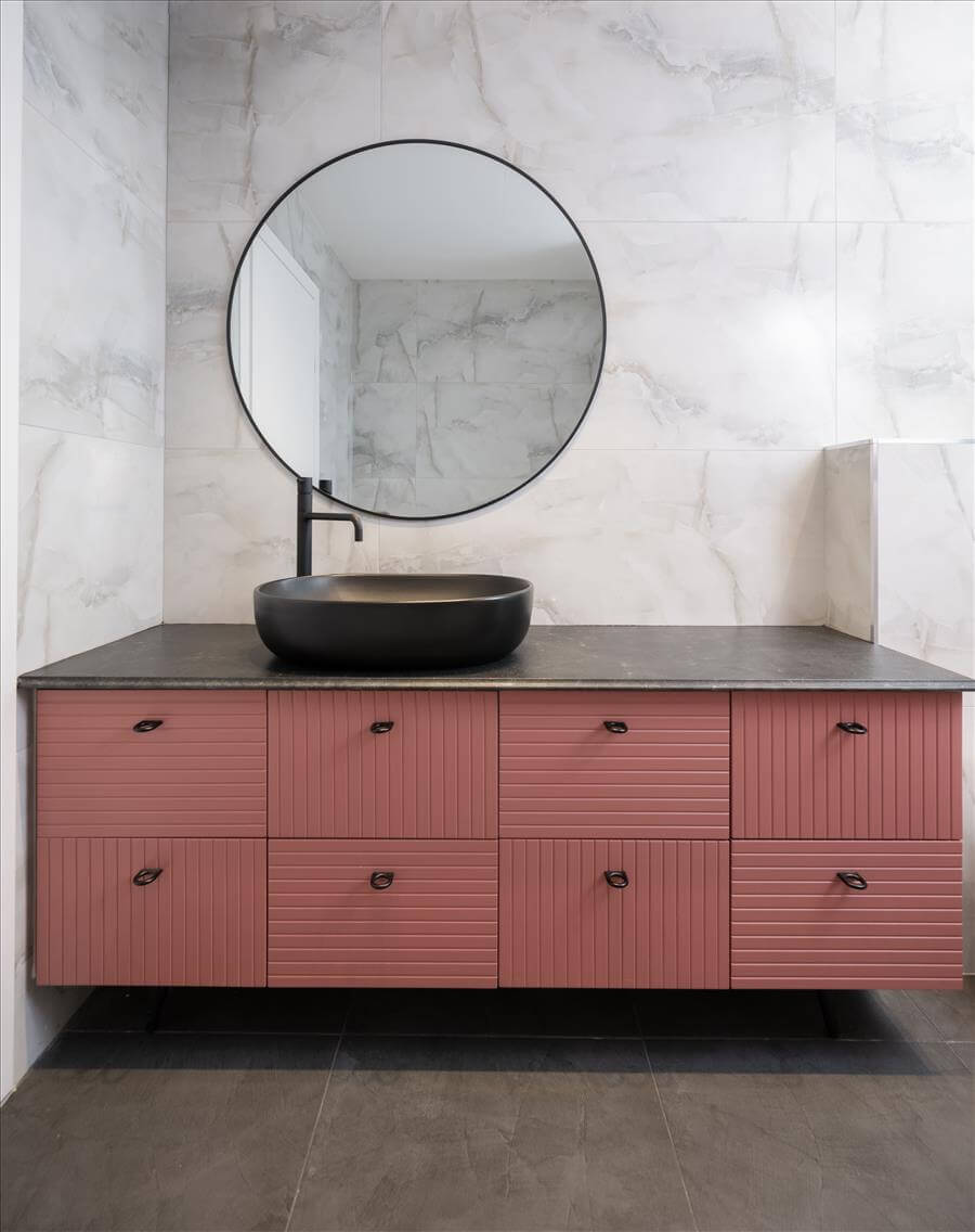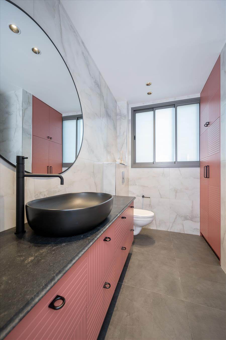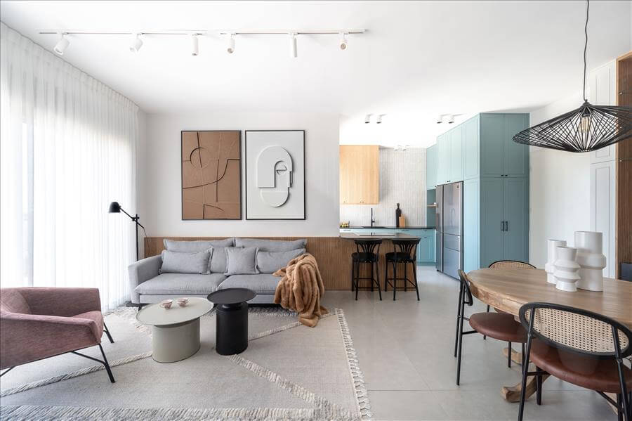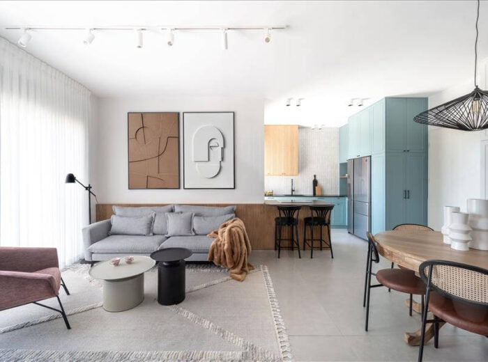 בני הזוג רכשו את הדירה מהקבלן בסיום הבניה כשהיא בנויה ומרוצפת, אך ללא מטבח. מכיוון שהתקציב היה מוגבל, השארתי את כל הריצופים והחיפויים המקוריים, וטיפלתי בחללים השונים בפרטי נגרות וטקסטיל שהקפיצו את המראה הכללי.