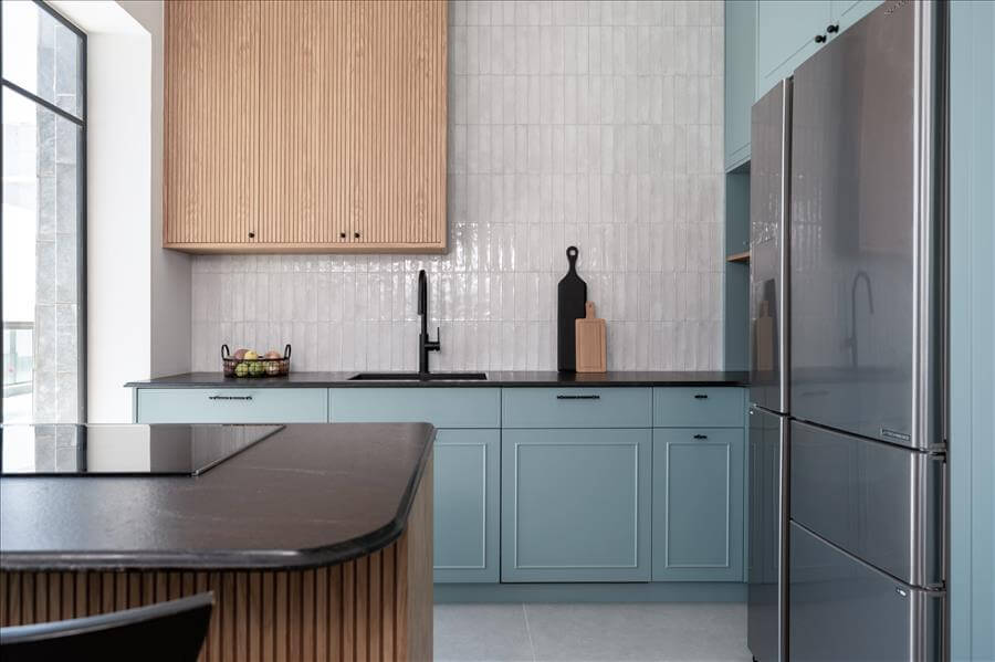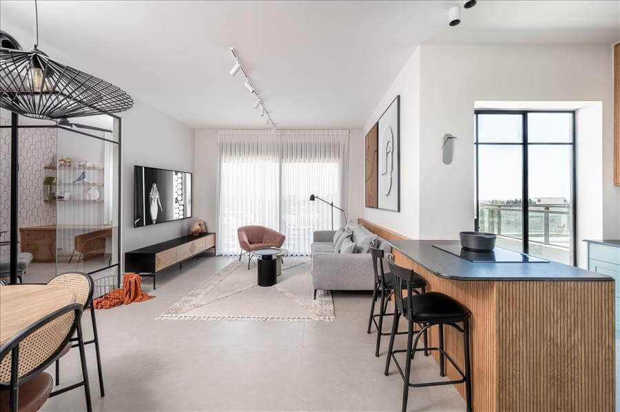 את דלפק המטבח חיפיתי בפורניר מחורץ שממשיך ומחפה את קיר הספה ונותן מראה ייחודי ומעצים את הנראות של המטבח.