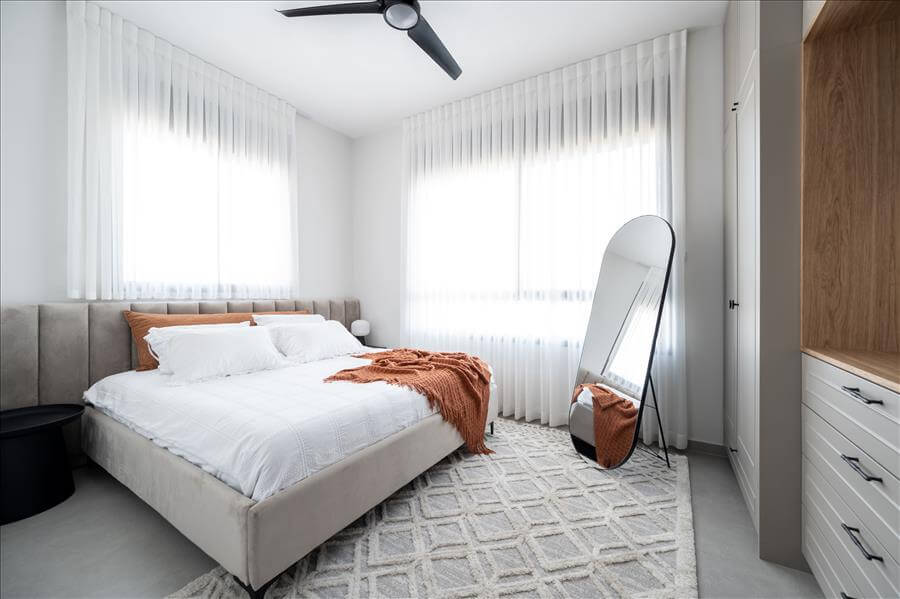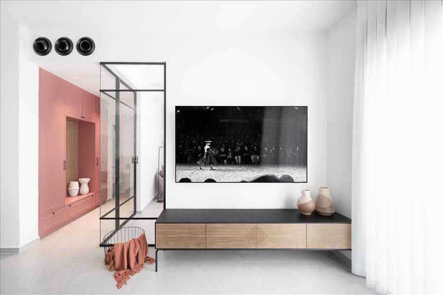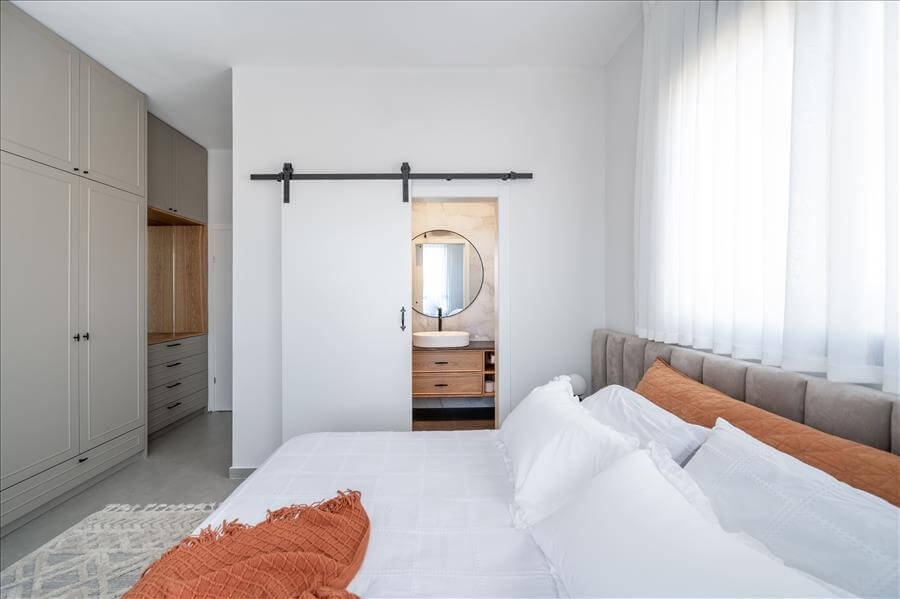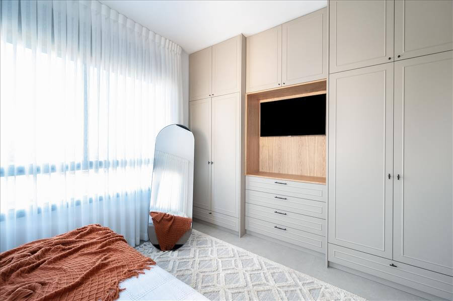 בחדר בשינה תוכנן קיר נגרות משמעותי שמכיל אחסון וגם נישה לטלוויזיה.