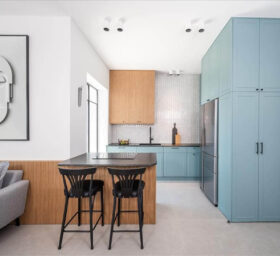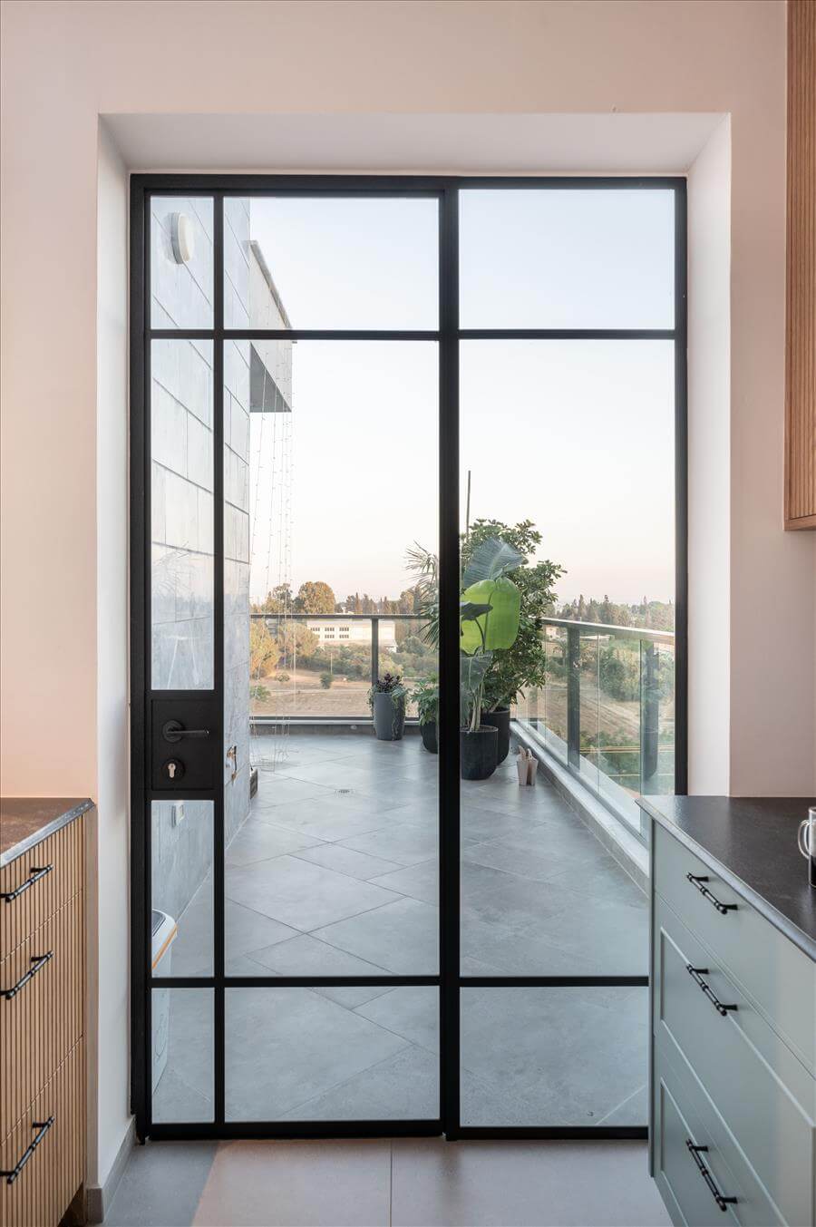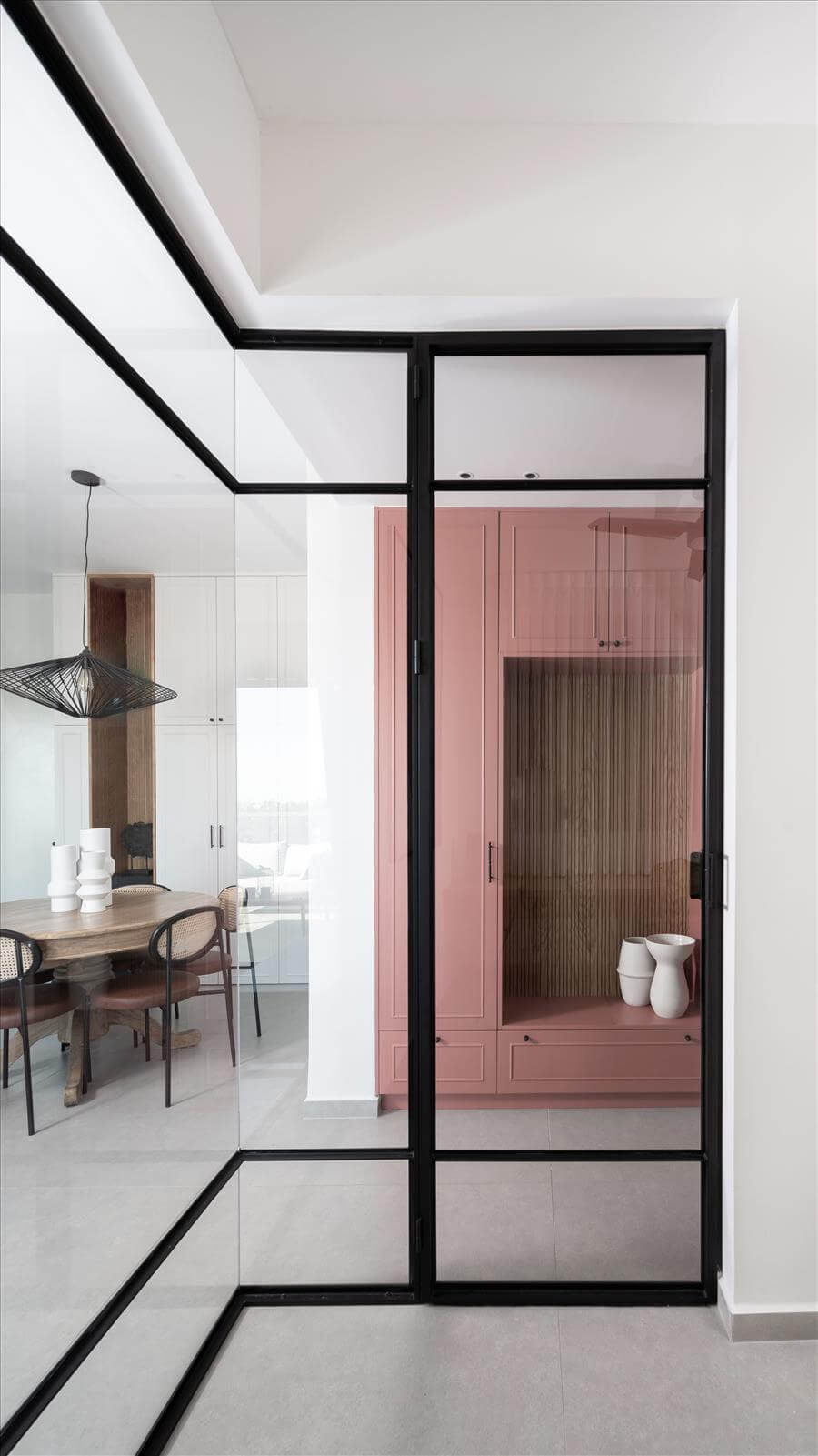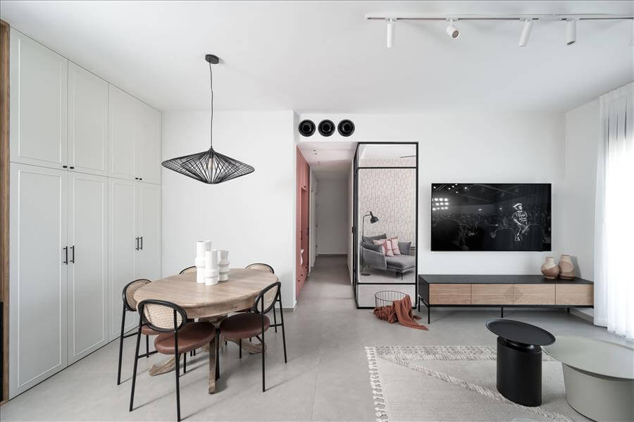תכננתי קיר אחסון גבוה שמסתיר בתוכו גם את ארון החשמל והתקשורת הסמוכים לכניסה לדירה. את חלון המטבח הפכנו לדלת בלגית שמאפשרת יציאה החוצה למרפסת הענקית שמכילה מטבח חוץ ופינת ישיבה. בכדי לייצר עוד אחסון משמעותי בחלל הדירה הזזתי את הקיר הגובל בין פינת האוכל למחסן וייצרתי נישה עמוקה שמכילה המון אחסון.