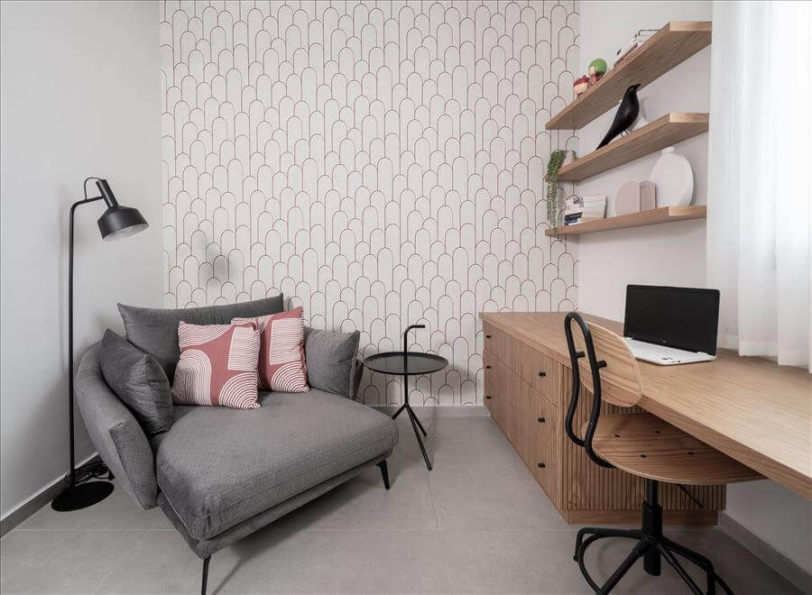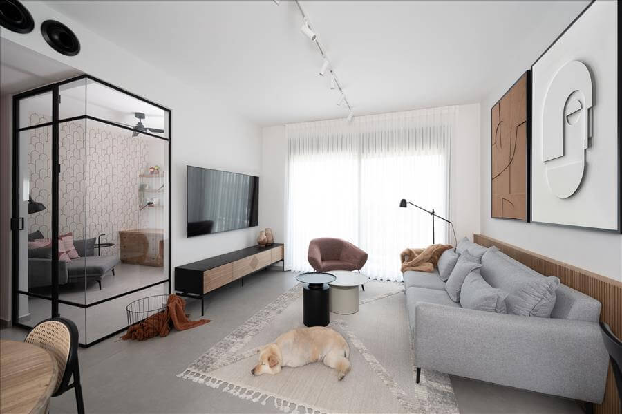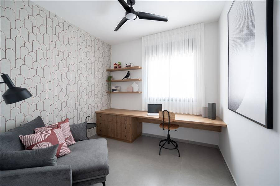 בכל חלל הדירה נעשו שינויים בחשמל ובתאורה. את פינת קיר חדר העבודה המקביל לסלון שברתי ע"מ לייצר מבטים ארוכים לכיוון החלל הציבורי הלא מאוד גדול.