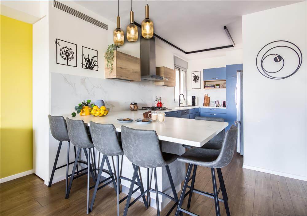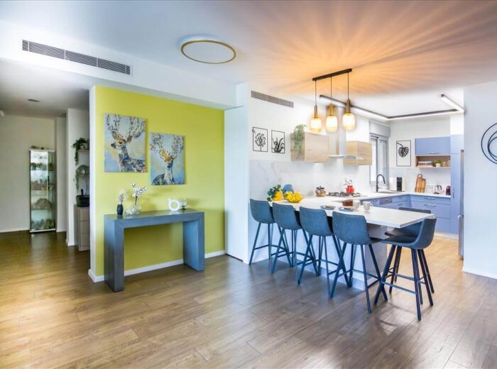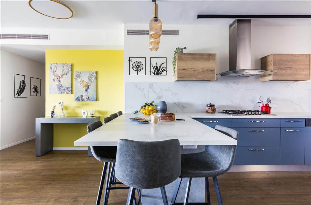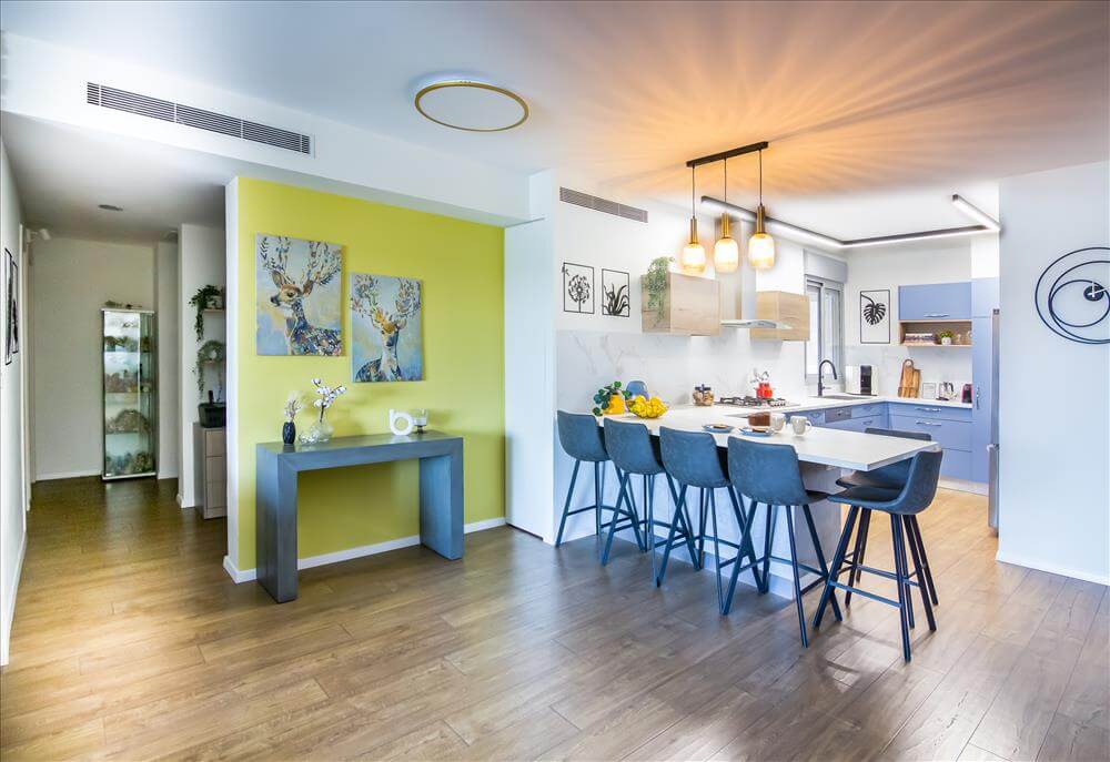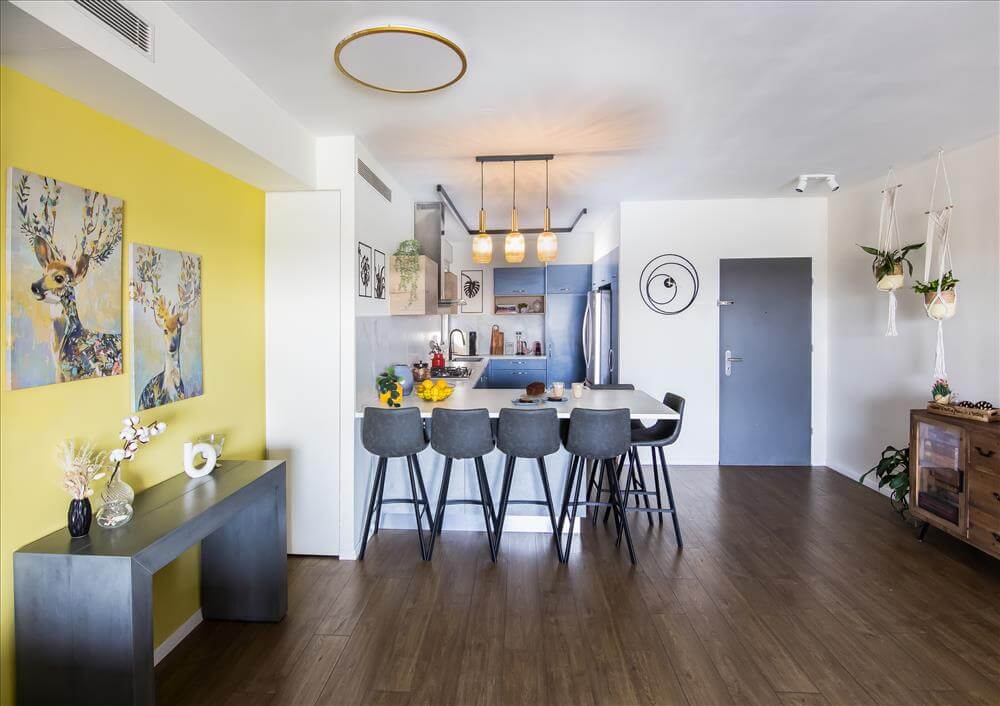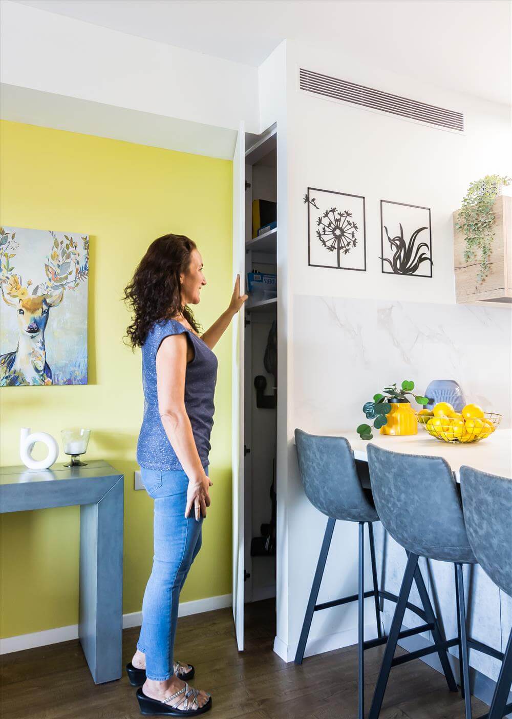 על מנת להשיג ללקוחות את המטבח המרווח והפונקציונלי שהם רצו – הצעתי לוותר על פינת האוכל הנוכחית שהיתה להם, אשר היתה גדולה מדי לחלל הקיים ולא איפשרה לנצל אותו באופן מיטבי. במקומה רכשנו להם קונסולה יפהפיה, דמויית בטון ונפתחת, שהוצבה לצד קיר שנצבע בגוון חרדל ייחודי ובשוטף משמשת כרהיט עיצובי ויפה. כאשר הם מארחים – הקונסולה נפתחת באמצעות הגדלות וכסאות שמאוחסנים ב"נישת קסם נעלמת" שיצרנו לידה.