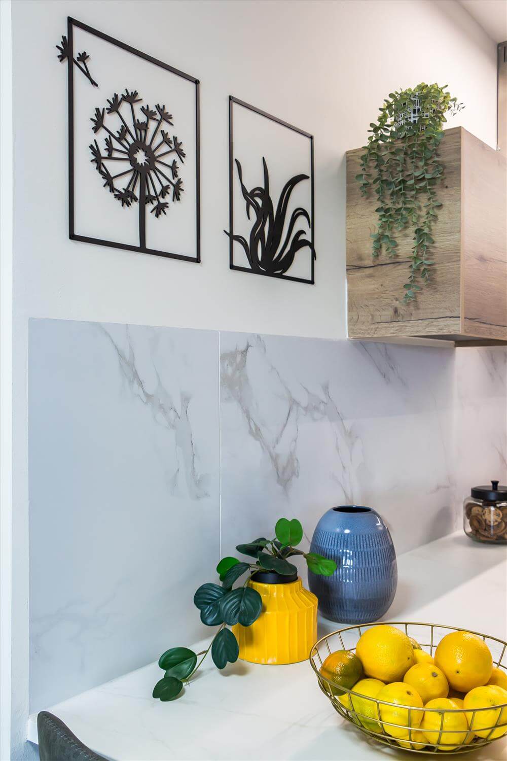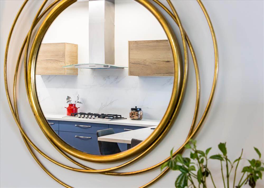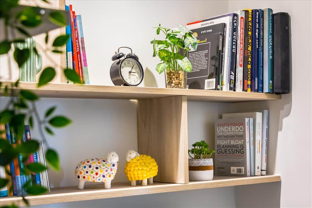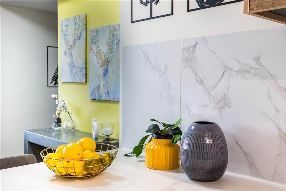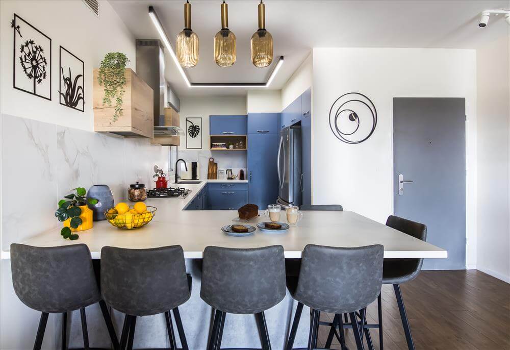 על מנת להשיג ללקוחות את המטבח המרווח והפונקציונלי שהם רצו – הצעתי לוותר על פינת האוכל הנוכחית שהיתה להם, אשר היתה גדולה מדי לחלל הקיים ולא איפשרה לנצל אותו באופן מיטבי. במקומה רכשנו להם קונסולה יפהפיה, דמויית בטון ונפתחת, שהוצבה לצד קיר שנצבע בגוון חרדל ייחודי ובשוטף משמשת כרהיט עיצובי ויפה. כאשר הם מארחים – הקונסולה נפתחת באמצעות הגדלות וכסאות שמאוחסנים ב"נישת קסם נעלמת" שיצרנו לידה.