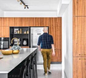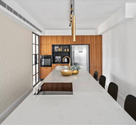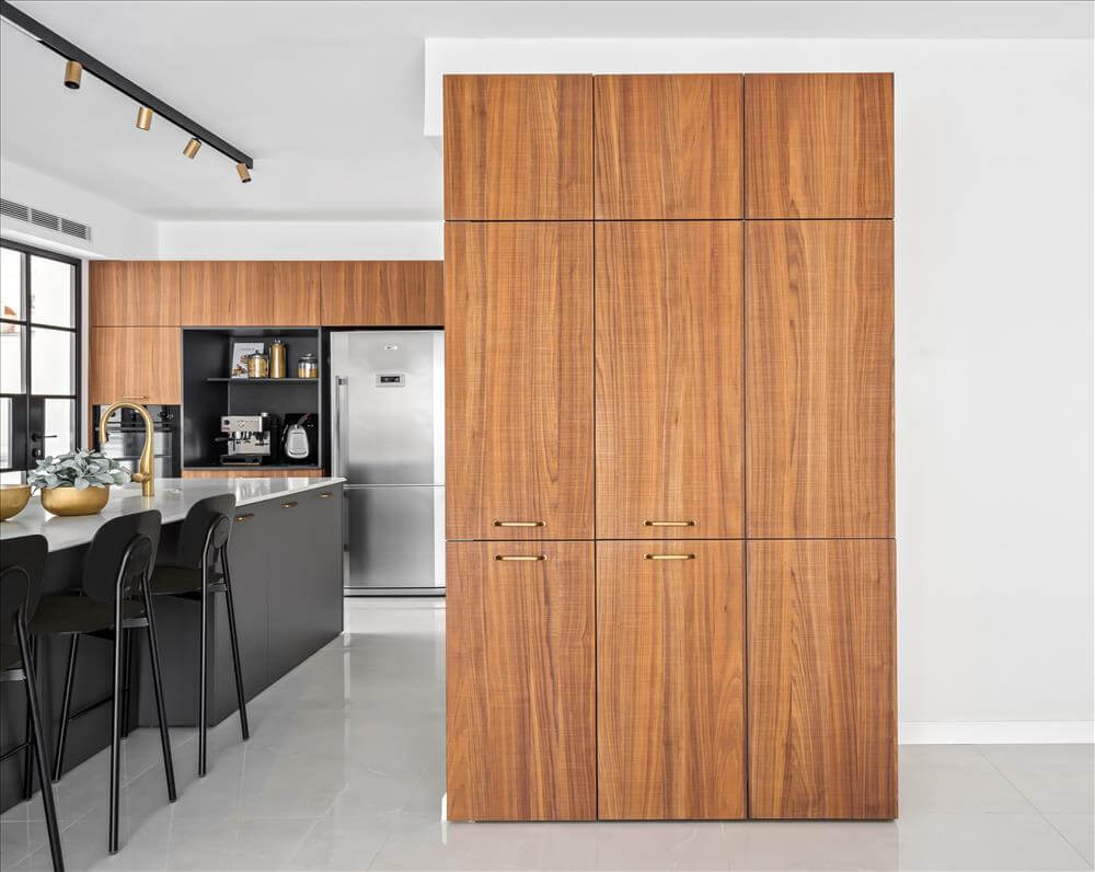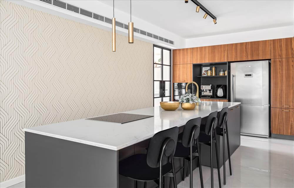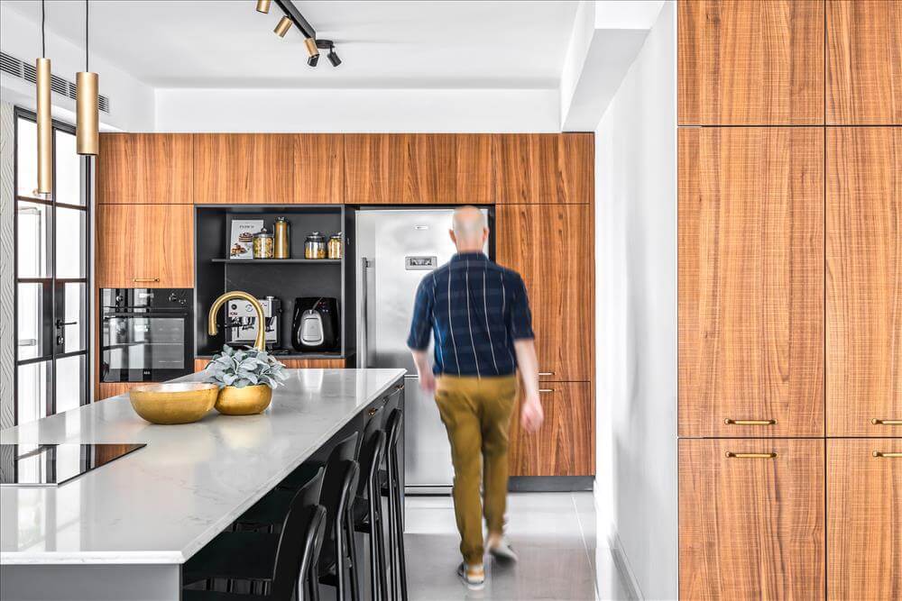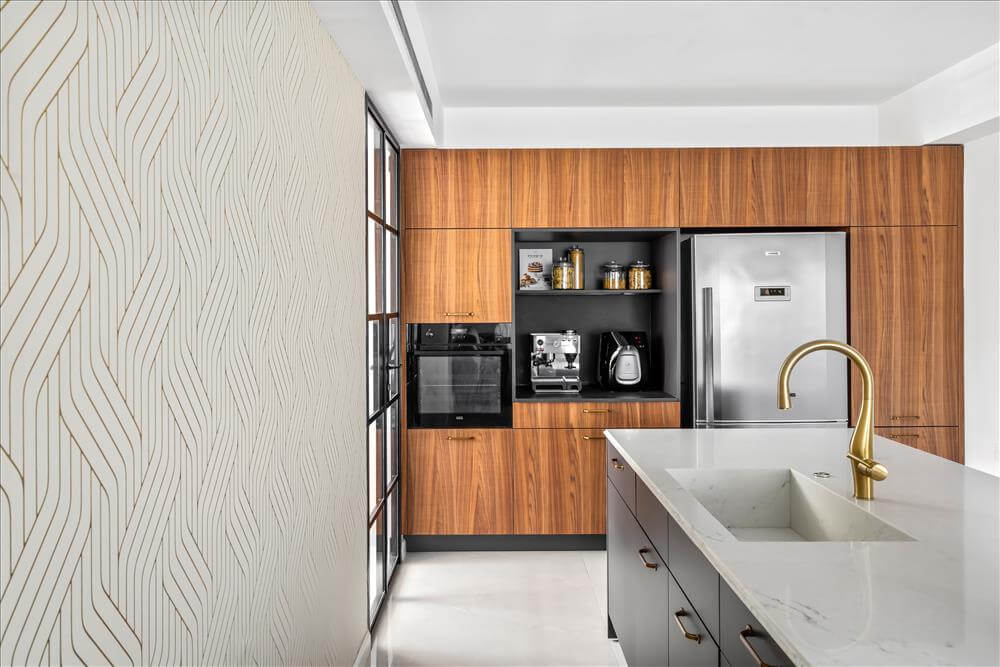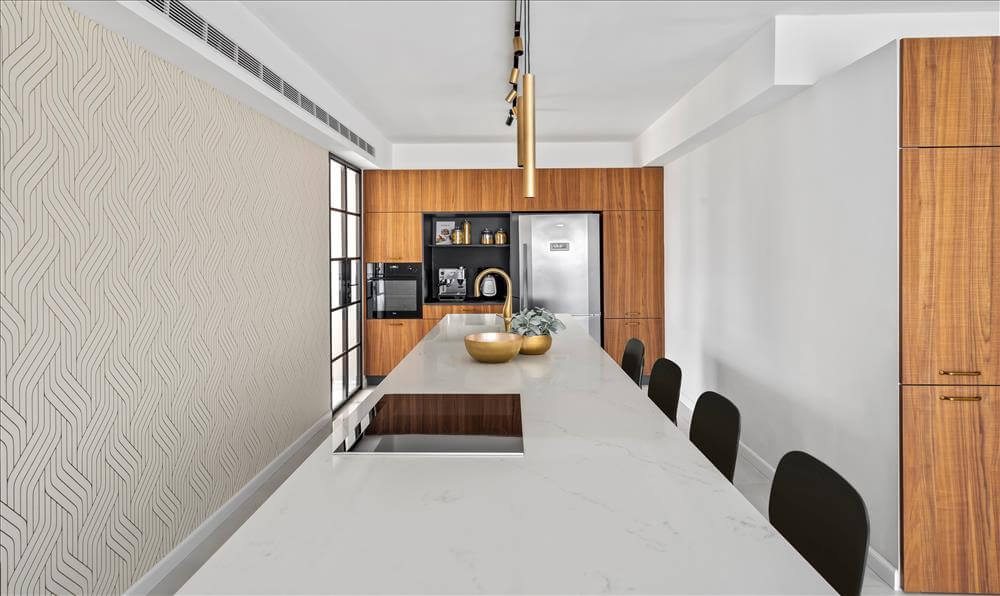 במקור קיבלו הדיירים את מטבח הקבלן שהיה קטן ודל במשטחי עבודה ואחסון, המטבח הוחלף במטבח מפנק (סמל) על שטח כפול מהמקורי. צלע אחת כוללת את הארונות הגבוהים ונישה פתוחה למכונת קפה, במרכז החלל תוכנן אי עבודה חלומי שאורכו ארבעה מטרים. האי מורכב מבסיס ובו שפע של ארונות אחסון ומגירות כשמעליו משטח עבודה רחב ידיים בצבע לבן עם גידים אפורים (פרביטל) עם כיור בנוי מאבן קוורץ. בצמוד לאי יש ארבעה כיסאות בר שחורים ומעליו תלוי פס לד שחור שממנו יורדות מנורות זהב (דורי קמחי).