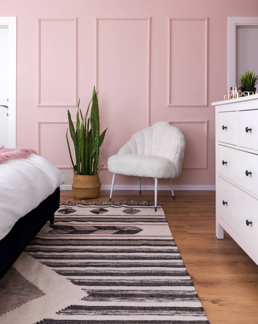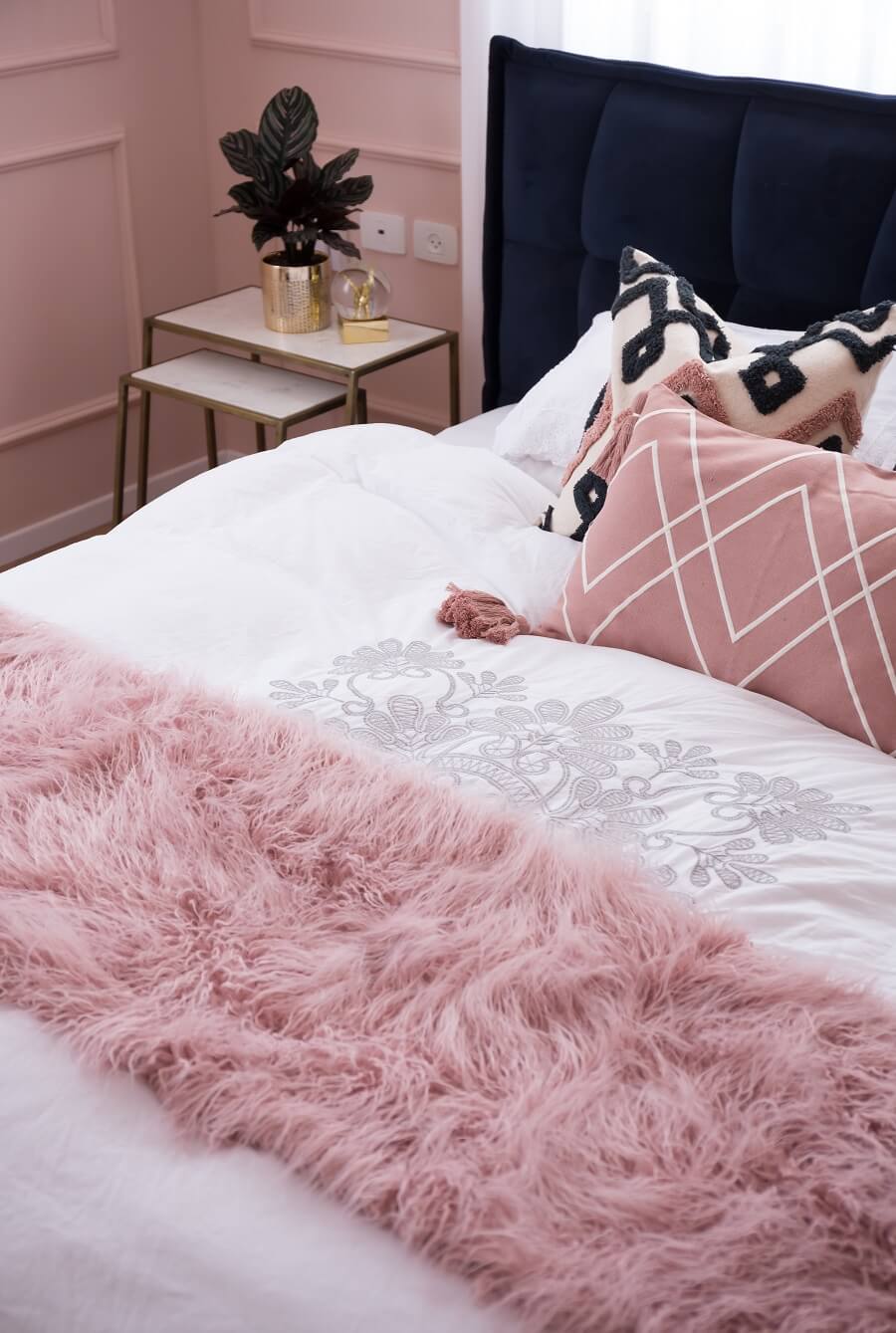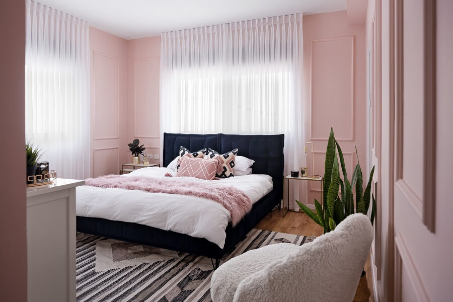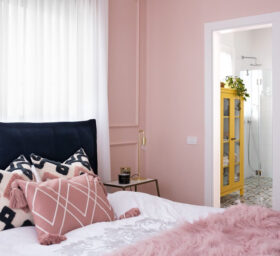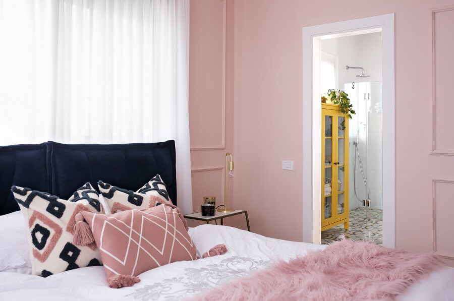 חדר השינה של ההורים מעוטר במסגרות מקרניזים דקים והקירות צבועים בצבע פודרה רך. המיטה מרופדת בבד קטיפה כחול ולצדיה שולחנות קפה קטנים – תחליף עדין לשידות צד היוצר מראה קליל ולא מתאמץ.