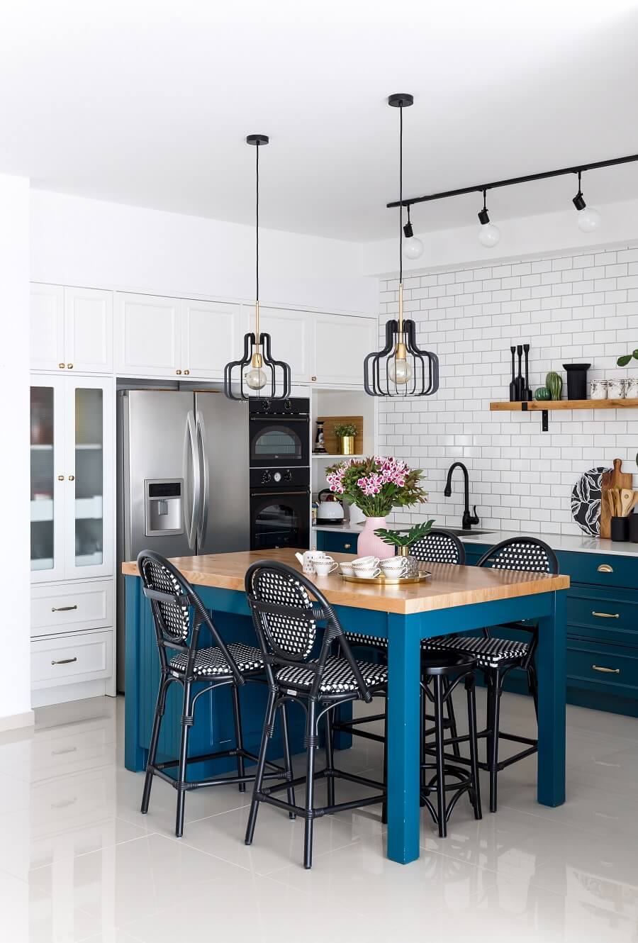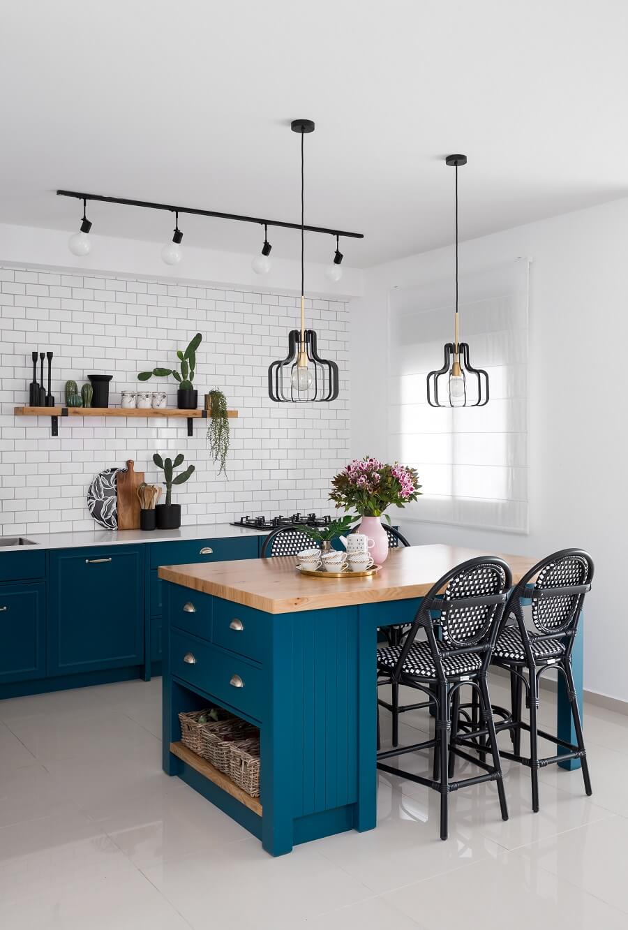 דלת הכניסה נפתחת אל החלל הציבורי כשמצד שמאל נמצא המטבח ומימין פינת האוכל והסלון. המטבח בנוי בצורת רי"ש כשבצלע אחת ארונות גבוהים עם חזיתות לבנות ובצלע השנייה ארונות נמוכים עם חזיתות בטורקיז כהה.