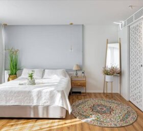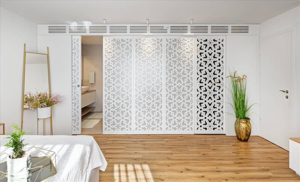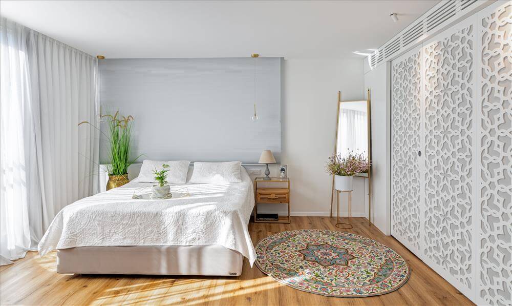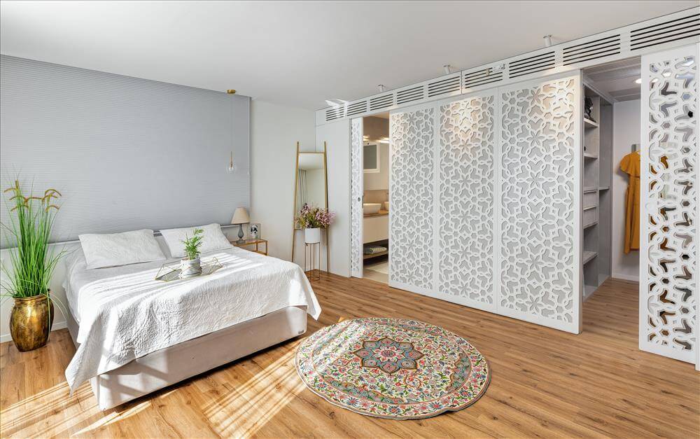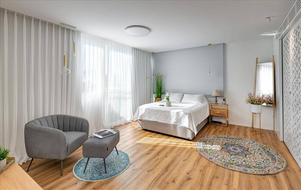 הכי חשוב היה לה – חדר השינה, את חדר שינה הסטנדרטי הפכנו לסוויטת הורים מהחלומות, את החלל הקיים הפכנו לחדר ארונות ומקלחת מפנקת, חלונות האלומיניום מהווים קירות החדר, ועל מנת לא לחסום את הנוף המדהים מהחלונות, עטפנו את החדר בווילונות שיוצרים האפלה מלאה ובידוד מפני החום/קור.