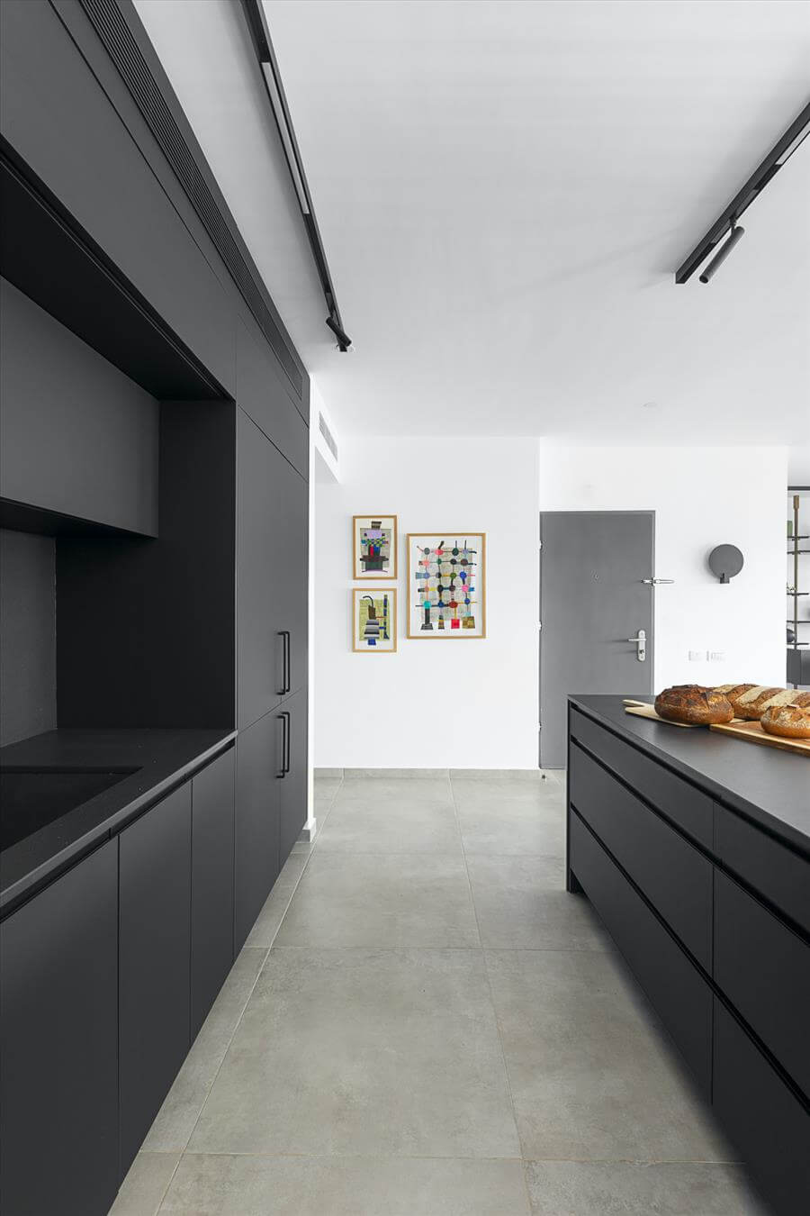 הניקיון העיצובי של המטבח הושג משימוש בידיות אינטגרליות בחלק ניכר מהחזיתות, ומהקפדה למצוא פתרונות אחסון למוצרי החשמל, כך שיהיו נסתרים לחלוטין. המטבח עשוי פורמייקה בטכנולוגיית ננו בגימור מט-משי, שמדמה צבע בתנור וקל מאוד לניקוי ותחזוקה. משטחי העבודה חופו בדקטון.