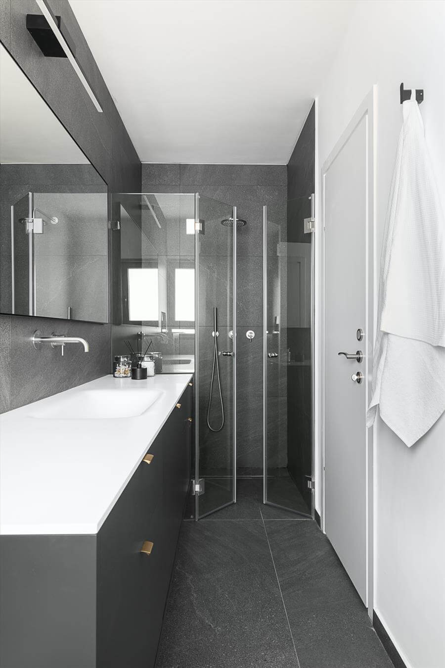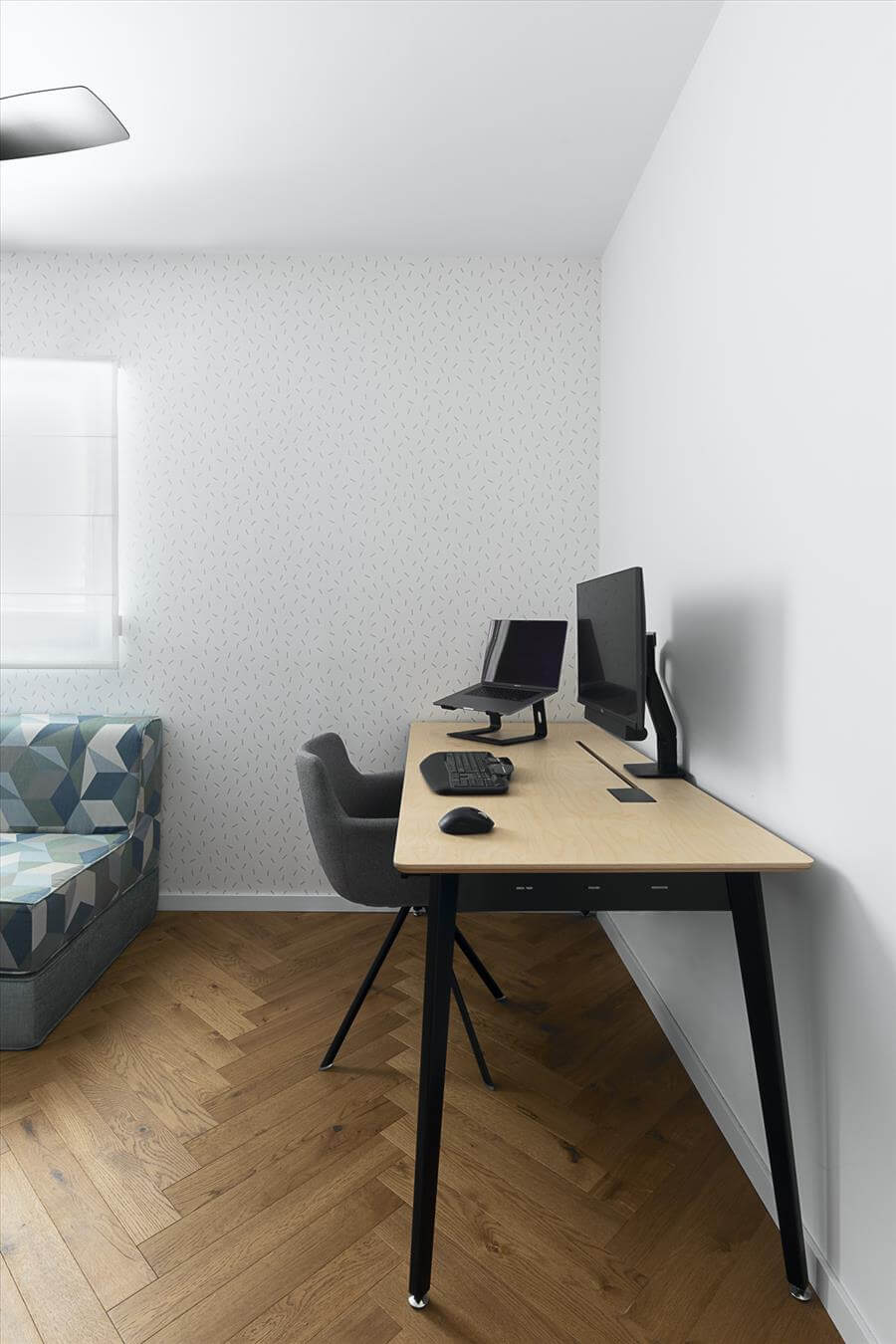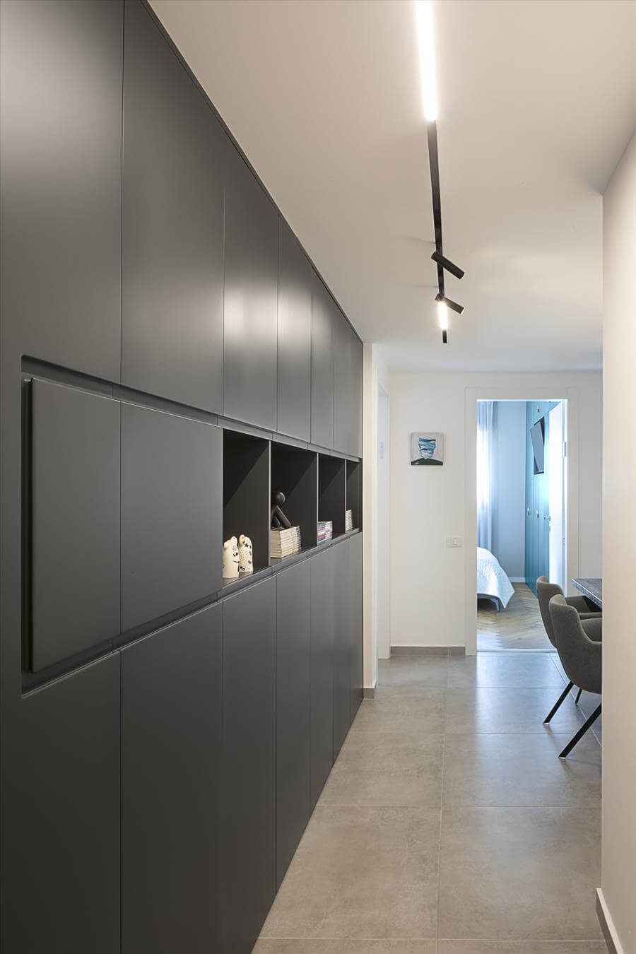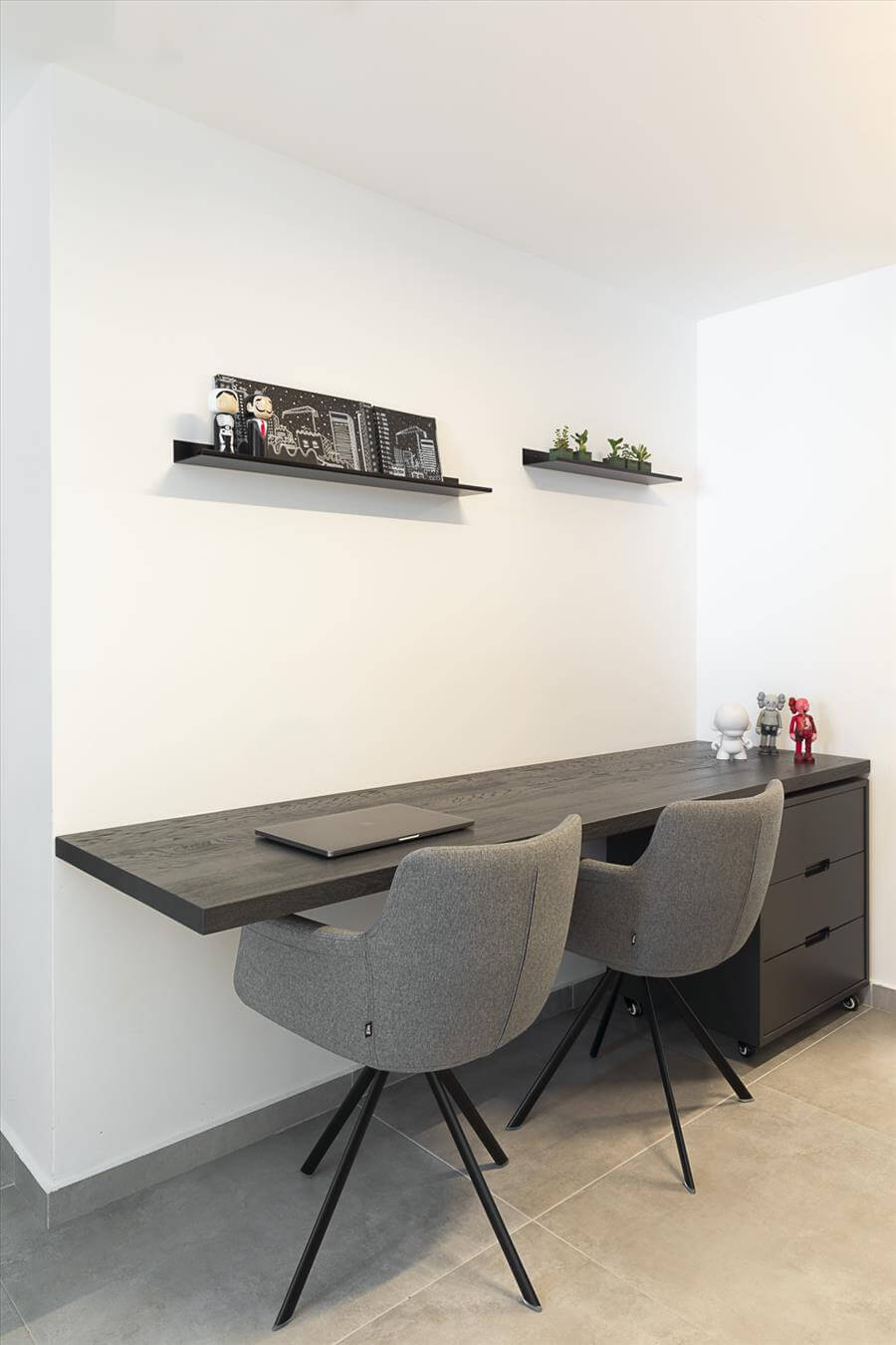 לצורך כך תוכנן ארון נישה לאורכו של המסדרון. עומקו של הארון 30 ס"מ, שקוזזו מחדרי השינה, והוא מייצר פתרון אחסון למעילים, נעליים, מקום נוסף לכלי המטבח ועוד ועוד. מול הארון תוכננה פינת עבודה קטנה מעץ שחור, שהתגלתה כחשובה מאוד בימים של למידה מהבית.