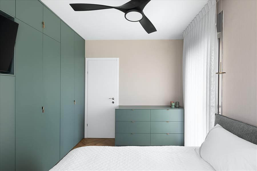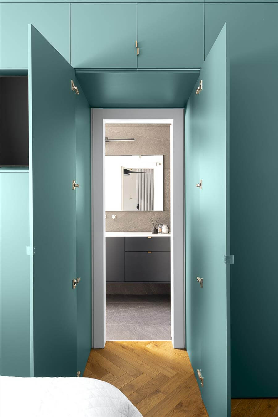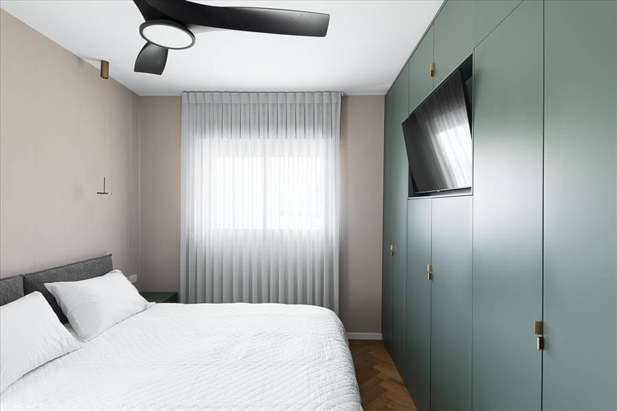 בחדר השינה ארון בגדים גדול שמשלב בתוכו את מסך הטלוויזיה, וכן דלת נסתרת לחדר הרחצה. הדלת הזו, שמהווה חלק אינטגרלי מארון הבגדים, היא פתרון אסתטי שמייצר גישה לחלל הרחצה בחדר המאסטר, ובה בעת לשמור על מראה שלם והרמוני של ארון הבגדים.