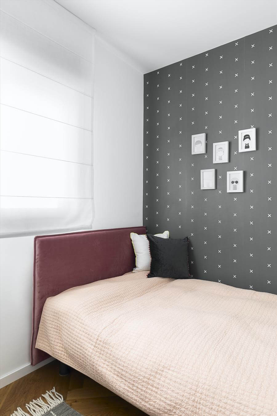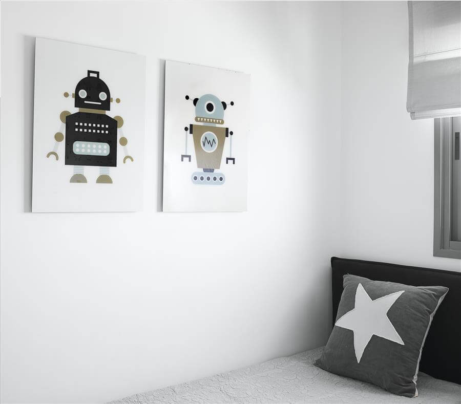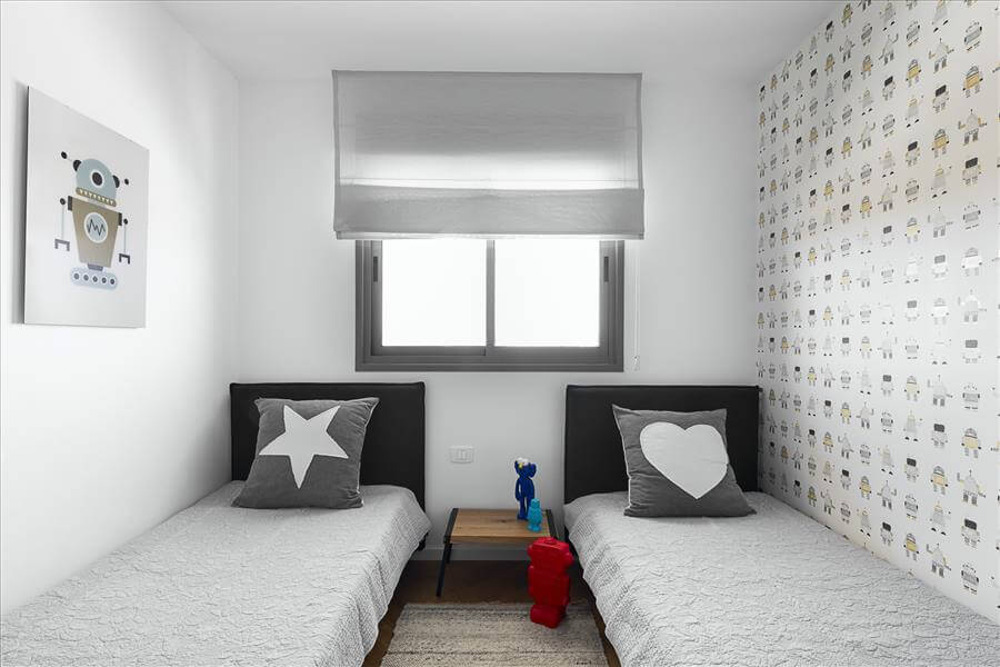 לצבעוניות משקל רב בהתוויית הסגנון והאווירה בחלל. בפרויקט הזה הילדים היו מעורבים, וכל אחד בחר לעצמו את פלטת הגוונים – החדר של הבת הגדולה עוצב בגווני אפור כהה ולבן בשילוב של בורגונדי עז, בחדר הבת הקטנה שולבו טונים בהירים יותר של אפור ולבן, ואילו בחדר הבנים נבחר טפט רובוטים, שממנו נגזרו גם הפוסטרים שעוצבו במיוחד לחדר זה. בכל החדרים הותקן פרקט אלון מעושן בדוגמת פיש בון.