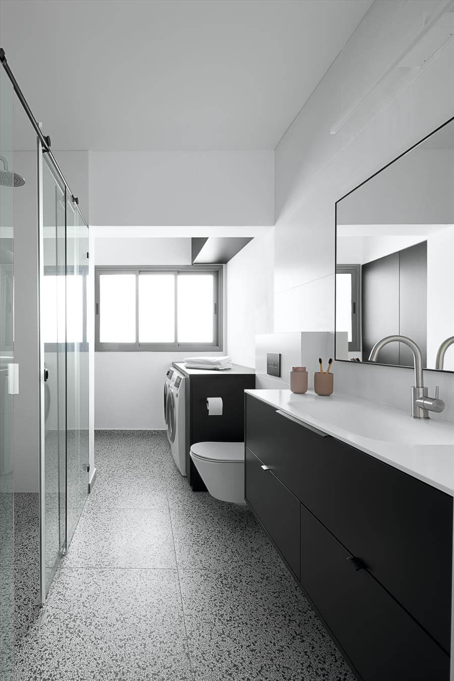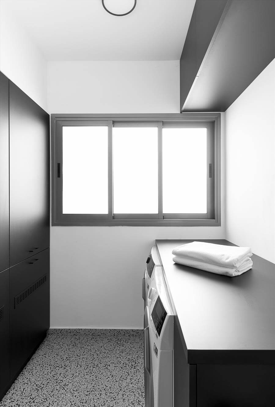 מעבר לקו האסתטי, החללים ניחנים ברמה פרקטית גבוהה, הן מבחינת תחזוקה והן מבחינת נגישות לדברים. מכונת הכביסה והמייבש מוקמו בתוך ארון עם חזית פתוחה, שמולו ארון שירות גדול בעומק 30 ס"מ בלבד. חדר הכביסה פתוח לחדר הרחצה של הילדים, ועומקו המינימלי של ארון השירות מסייע בשמירה על המרחב בחדר צר יחסית, ומאפשר צפייה בכל התכולה שלו בלי לאבד חומרי ניקוי בעומק הארון.