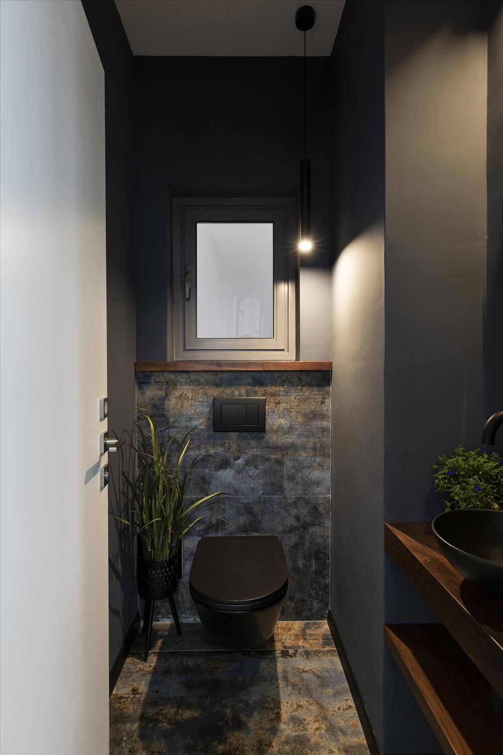 בשרותי האורחים ריצוף באריחים גדולים, בגוונים כהים ועמוקים של כחול עם כתמים בחרדל ושחור. הריצוף מחפה את קיר המושב עד לגובה החלון שעליו מדף עץ אלון. הקירות צבועים בכחול פלדה (הדהוד של צבע המטבח וקיר הכוח בסלון).