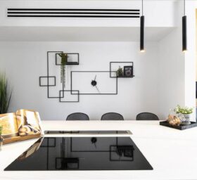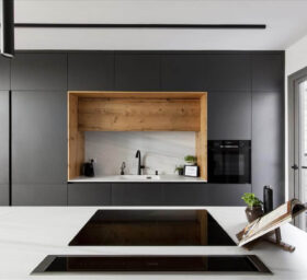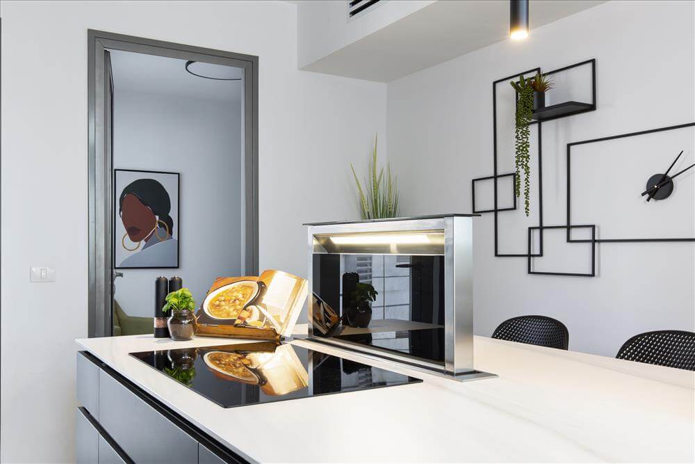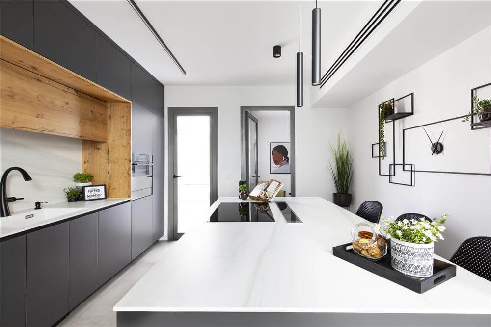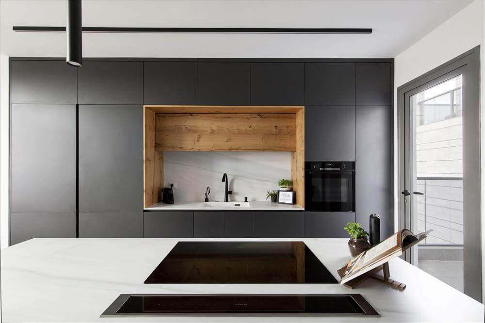 המטבח בסגנון מודרני בגוון אפור פלדה עמוק בשילוב שיש בהיר ונישה מחופה עץ אלון מחורץ. מהמטבח כניסה למשרד ביתי אותו חולקים בני הזוג .