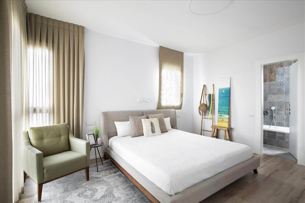 לסוויטת השינה נבחרו גוונים בהירים וניטראליים המשרים רוגע ושלווה.
