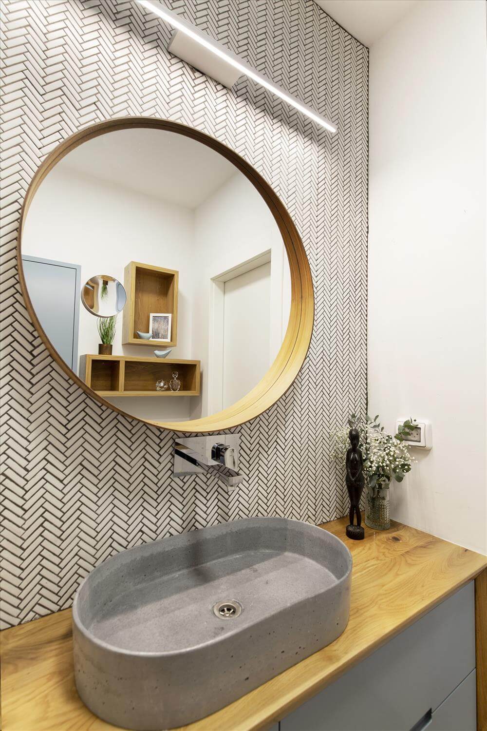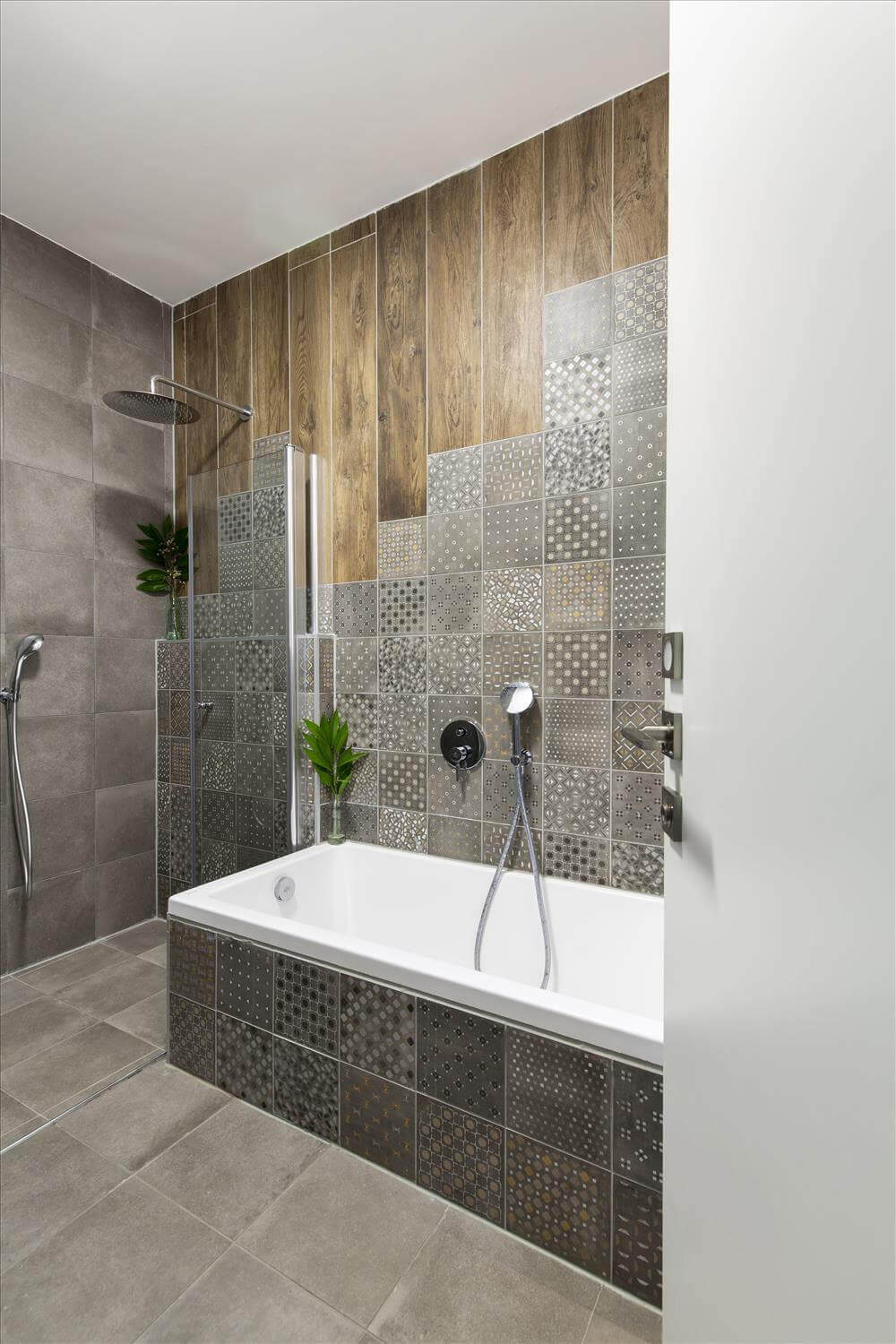 לחדר הרחצה נבחר חיפוי קירות מיוחד המשלב אריחים דמוי פרקט ביישום אנכי, ומיקס אריחים באפור בטון מצוירים בדוגמאות שונות ועדינות.