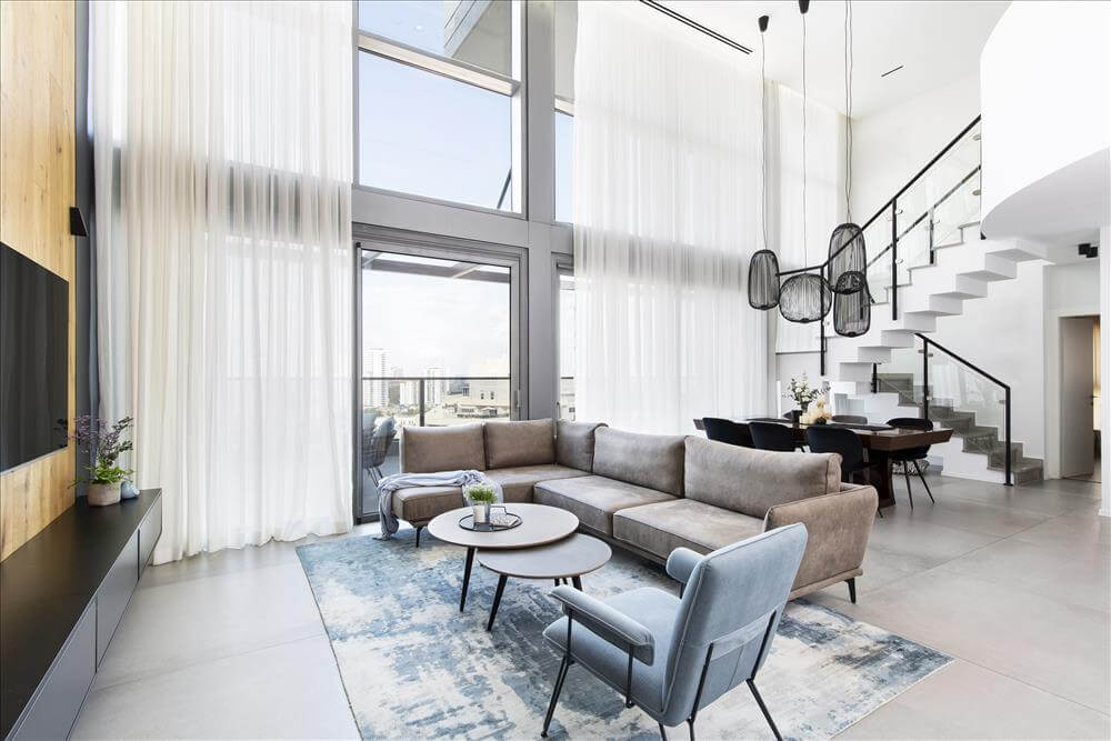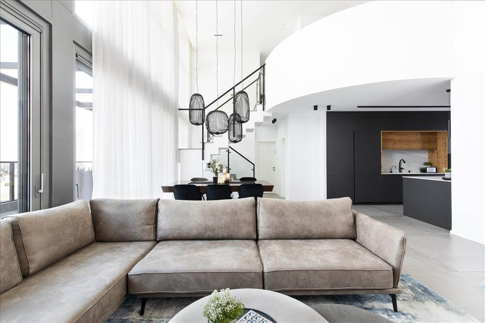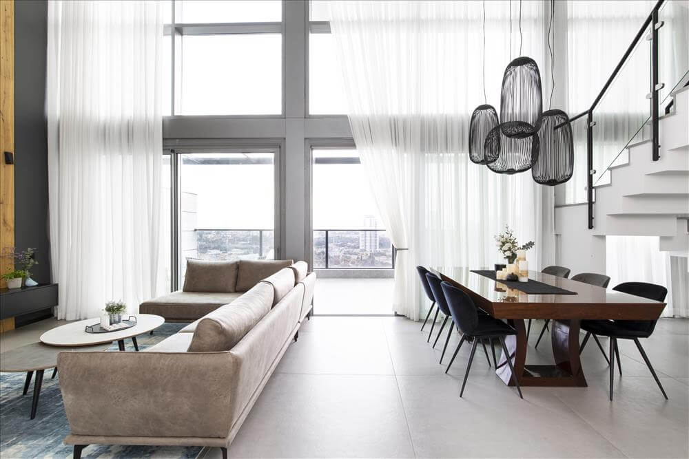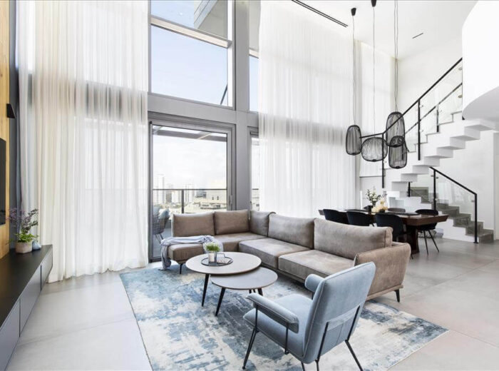 תכנון ועיצוב דופלקס  בבניין בראשון לציון. הבית עוצב בסגנון מודרני בשתי פלטות צבעים. חלל ציבורי – גוונים כהים ועמוקים של אפור, עץ אלון