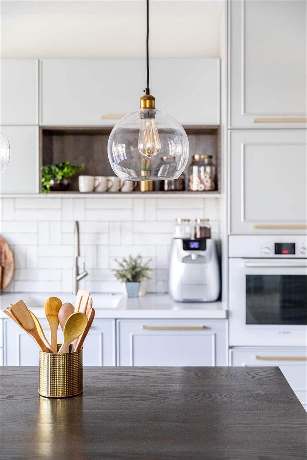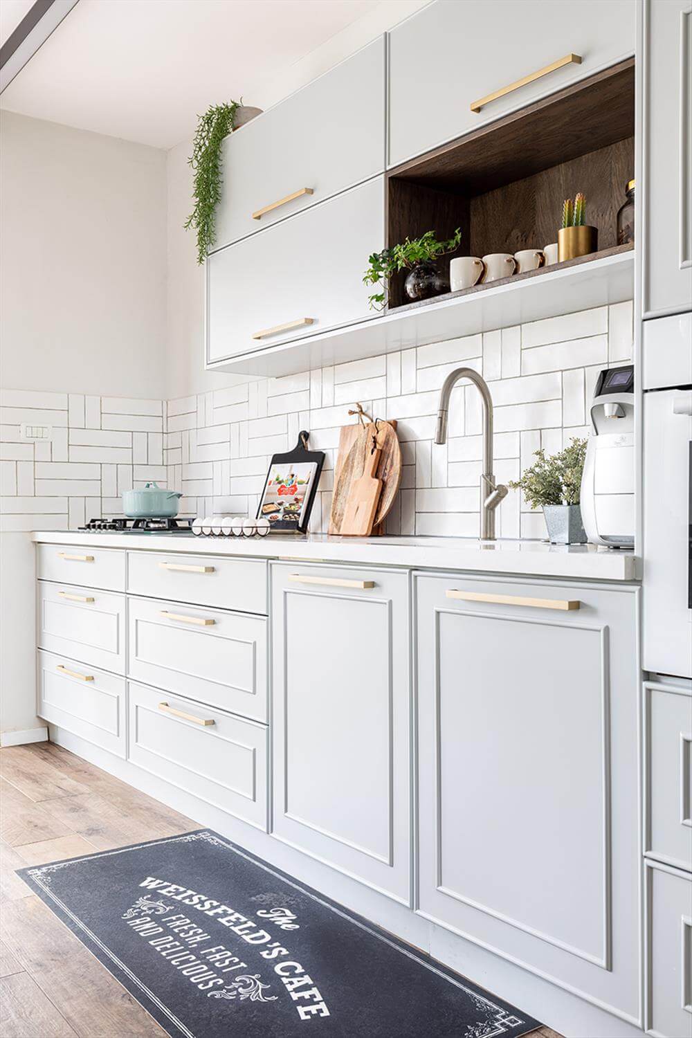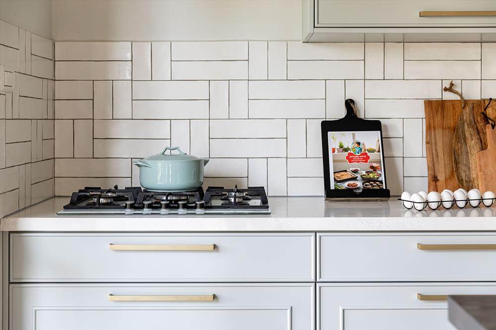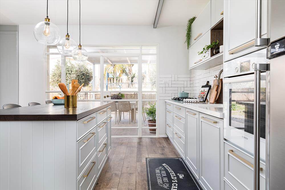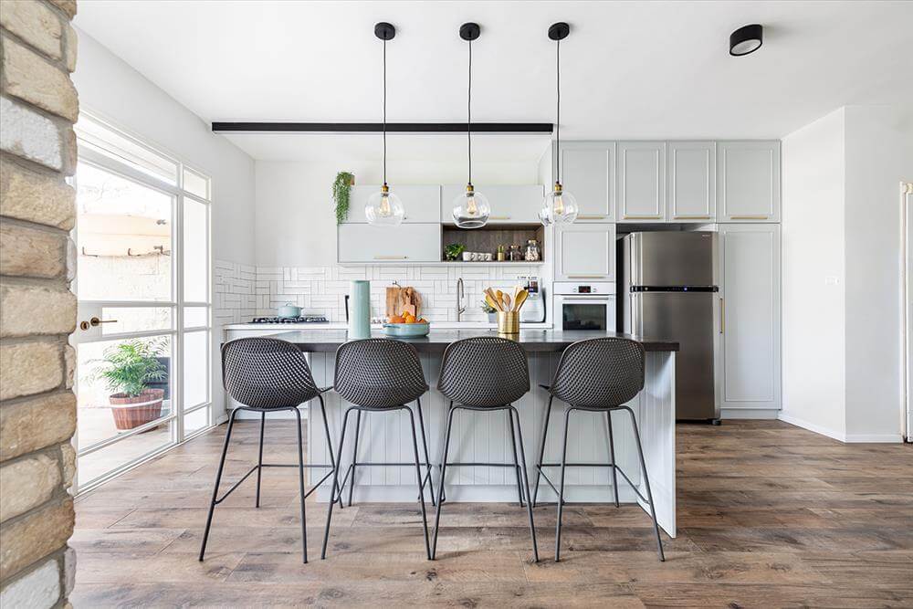 המטבח קיבל שטח גדול והרעיון למקם אותו ליד היציאה לגינה עונה על הצורך של המשפחה באירוח תכוף. האי במטבח מוקם בצורה מקבילה לארונות ובשעת אירוח גדול נפתחות החוצה דלתות האלומיניום דמוי הבלגי אותם החלפנו מדלתות ההזזה שהיו ומאפשרות הצמדת שולחן הגינה לאי כהמשך רציף אליו.