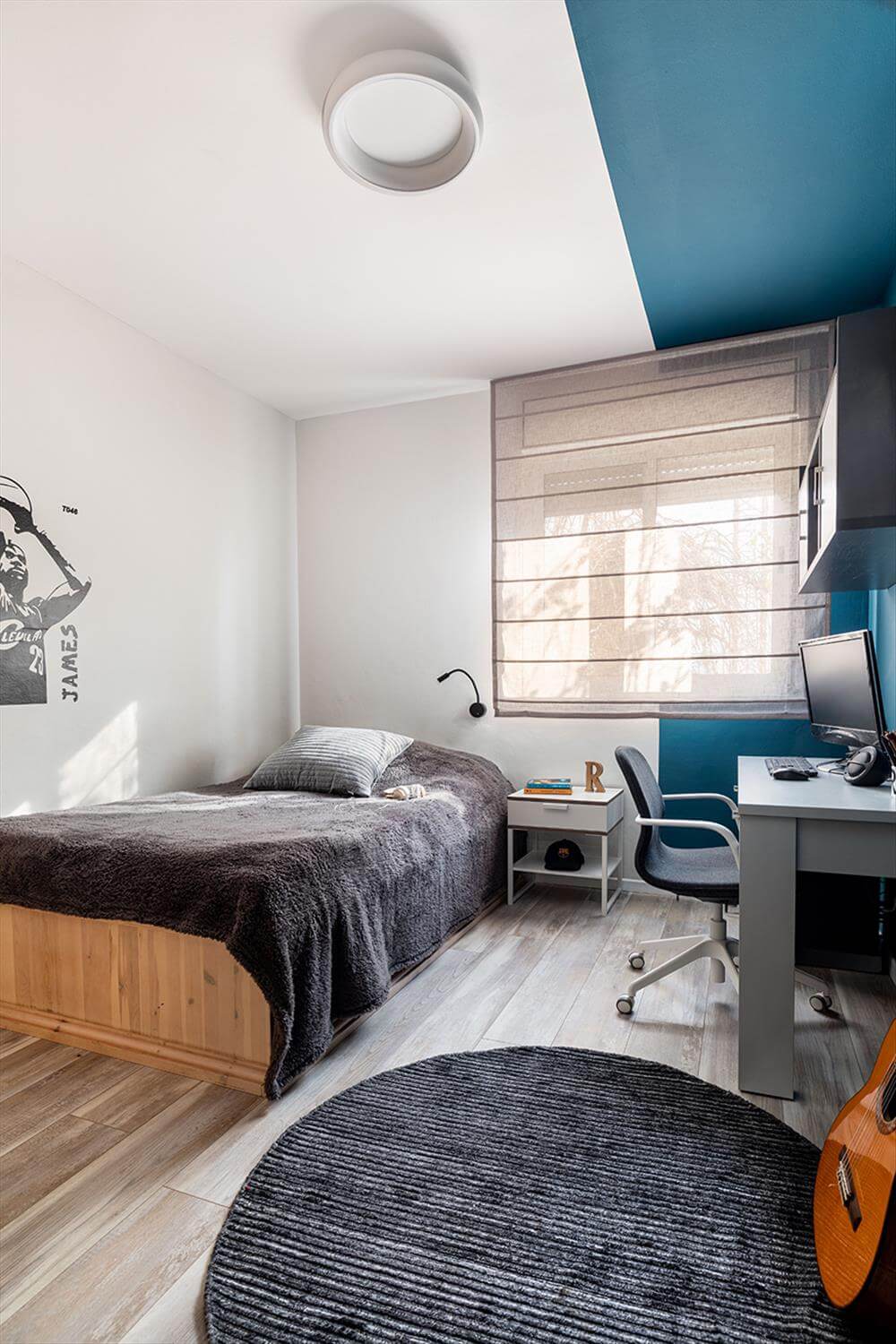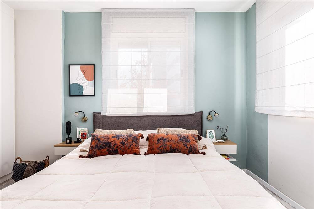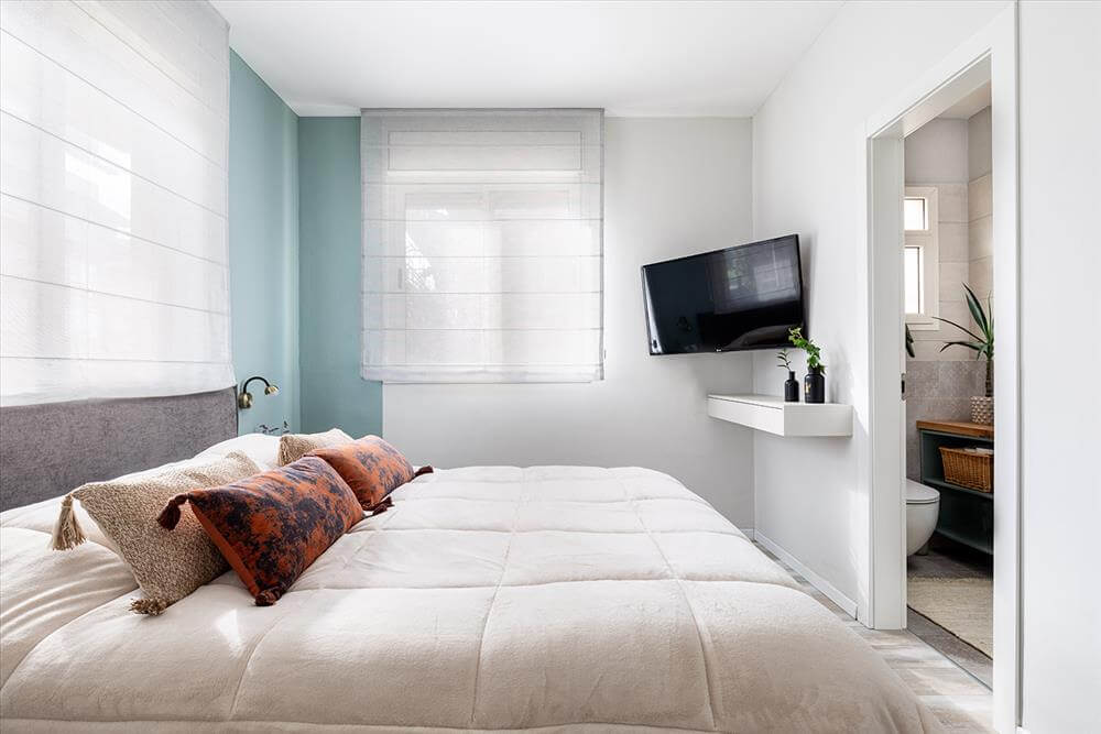 קיר המיטה נצבע בגוון תכלכל ירקרק שתכונותיו מרגיעות ומאזנות ומשוות לחדר מקום מכיל, של ביחד, לשים ראש ולהיתמך, לקבל חיבוק בסוף היום ולהירגע. ארון רחב הותאם למידות ומשמש לאחסון רב של פריטים.