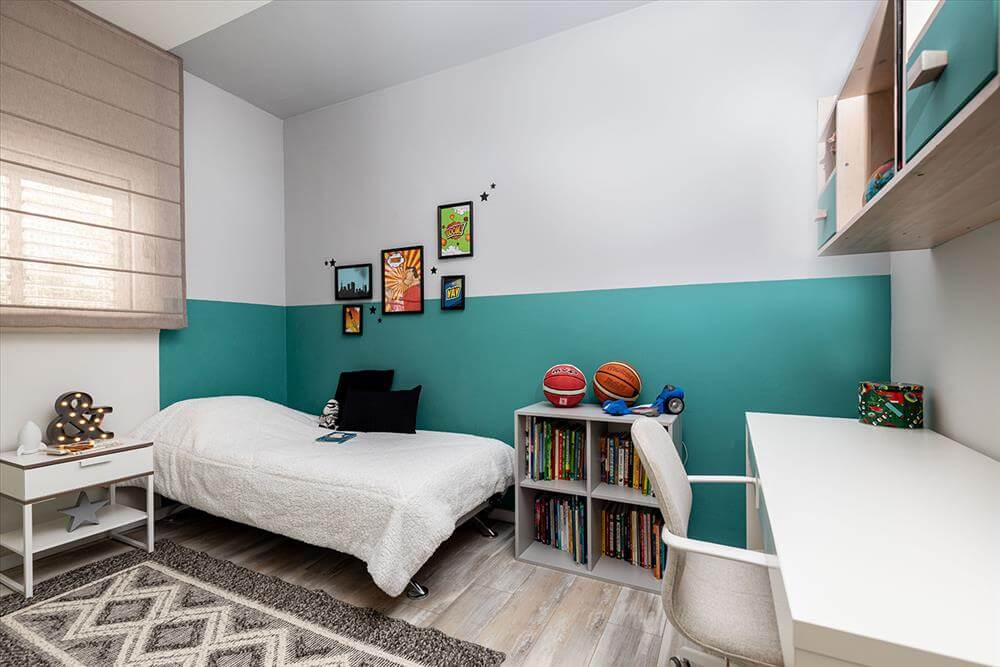 חדרי הילדים הם ביטוי אישי וניתנה להם יד חופשית בבחירת גוון הצבע אותו שייכתי והתאמתי לריהוט ולשאר הפריטים.
