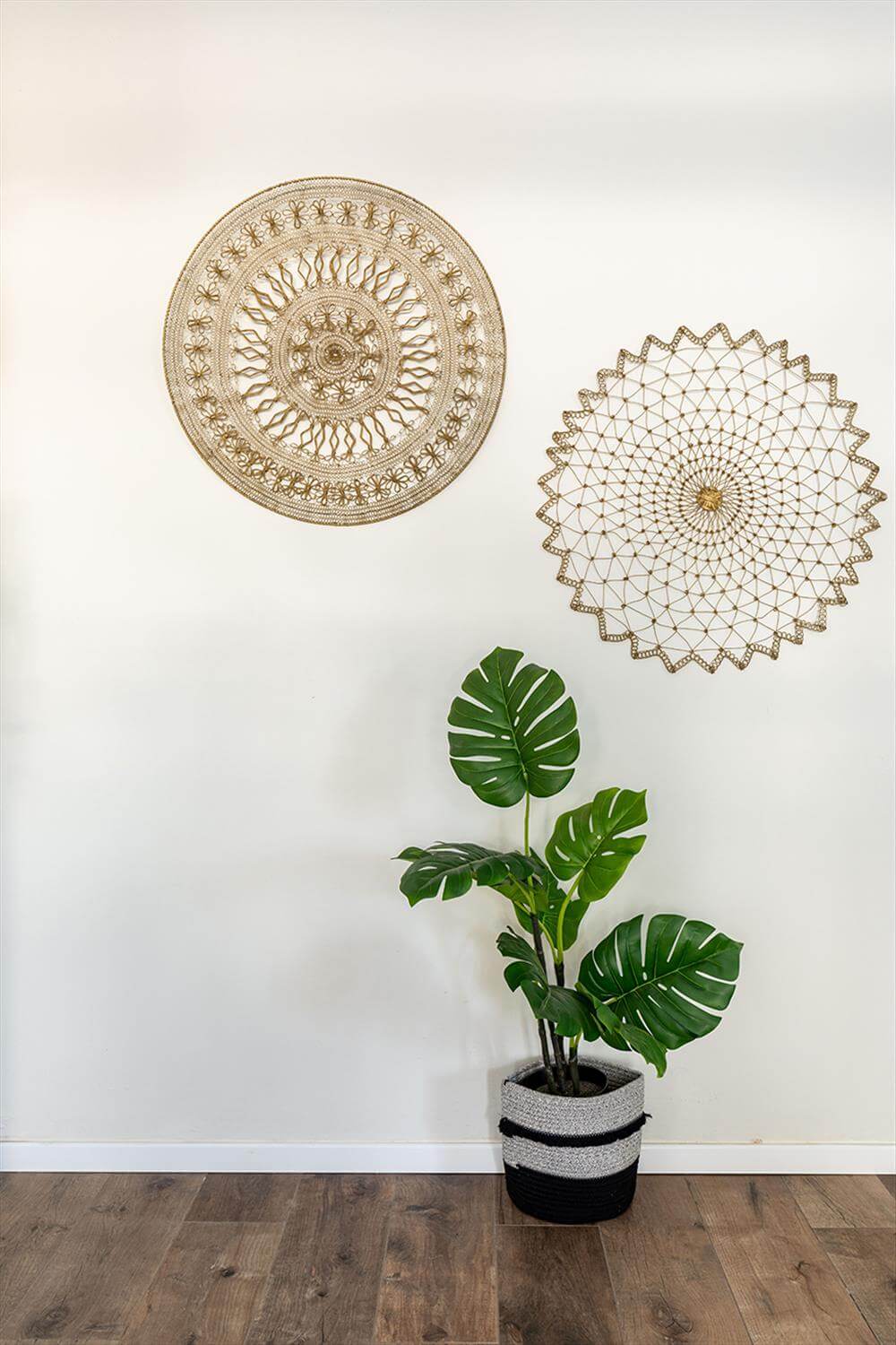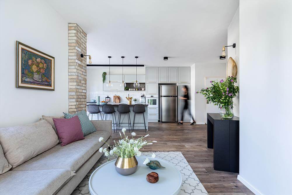 יצירת אוירה חמה ומזמינה מתבטאת בשילוב וחיבור החומרים יחד. הבחירה הראשונה שנעשתה היתה אריחי גרניט פורצלן איטלקיים דמוי פרקט, בקורות רחבות וארוכות המשוות לרצפה אוירה חמה וכפרית במיוחד. חזיתות המטבח נבחרו בהתאמה לסגנון הפרקט ונוסף להן קנט המזוהה עם הסגנון הכפרי. בכדי לאזן ולהכניס את המודרני, כל שאר הפריטים נבחרו כקונטרסט. ספה, שולחנות קפה, קונסולה, שטיח ואביזרים נקיים במראה ובגווני האפור